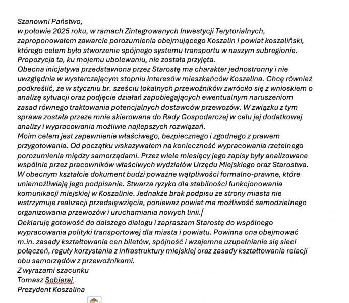 „W połowie 2025 roku (…) zaproponowałem zawarcie porozumienia obejmującego Koszalin i powiat koszaliński, którego celem było stworzenie spójnego systemu transportu w naszym subregionie” – powiedział. – „Propozycja ta (…) nie została przyjęta” – dodał.