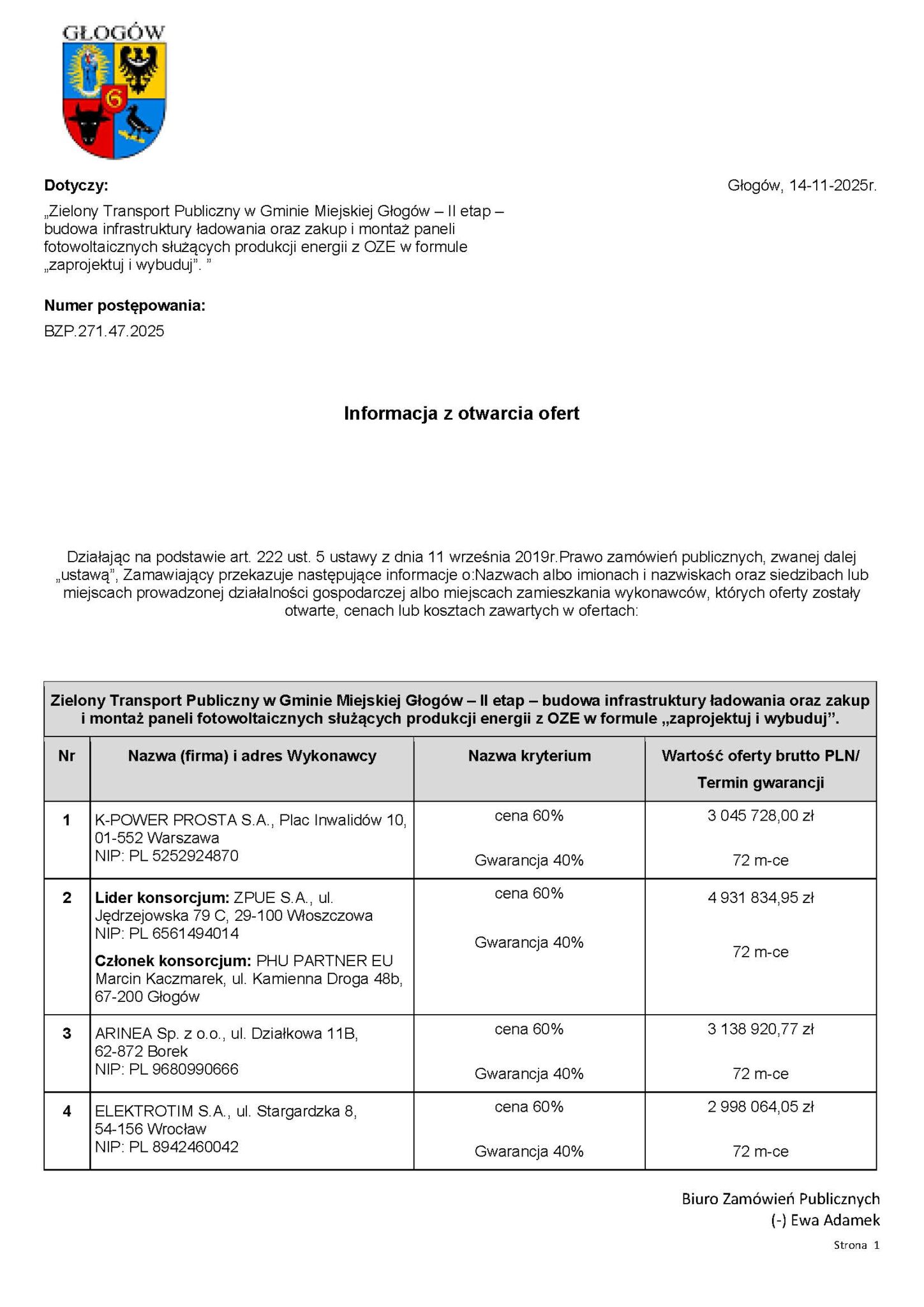 14 listopada 2025 roku, poznaliśmy oferty w przetargu pn. „Zielony Transport Publiczny w Gminie Miejskiej Głogów – II etap”.