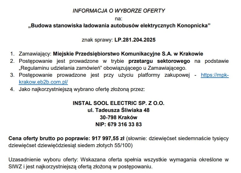 Na tej podstawie 8 stycznia 2026 roku przewoźnik poinformował, że wybiera ofertę firmy INSTAL SOOL ELECTRIC. Jest to znany już na rynku krakowskim wykonawca, który wygrał zamówienie na budowę ładowarki na pętli Rżąka.