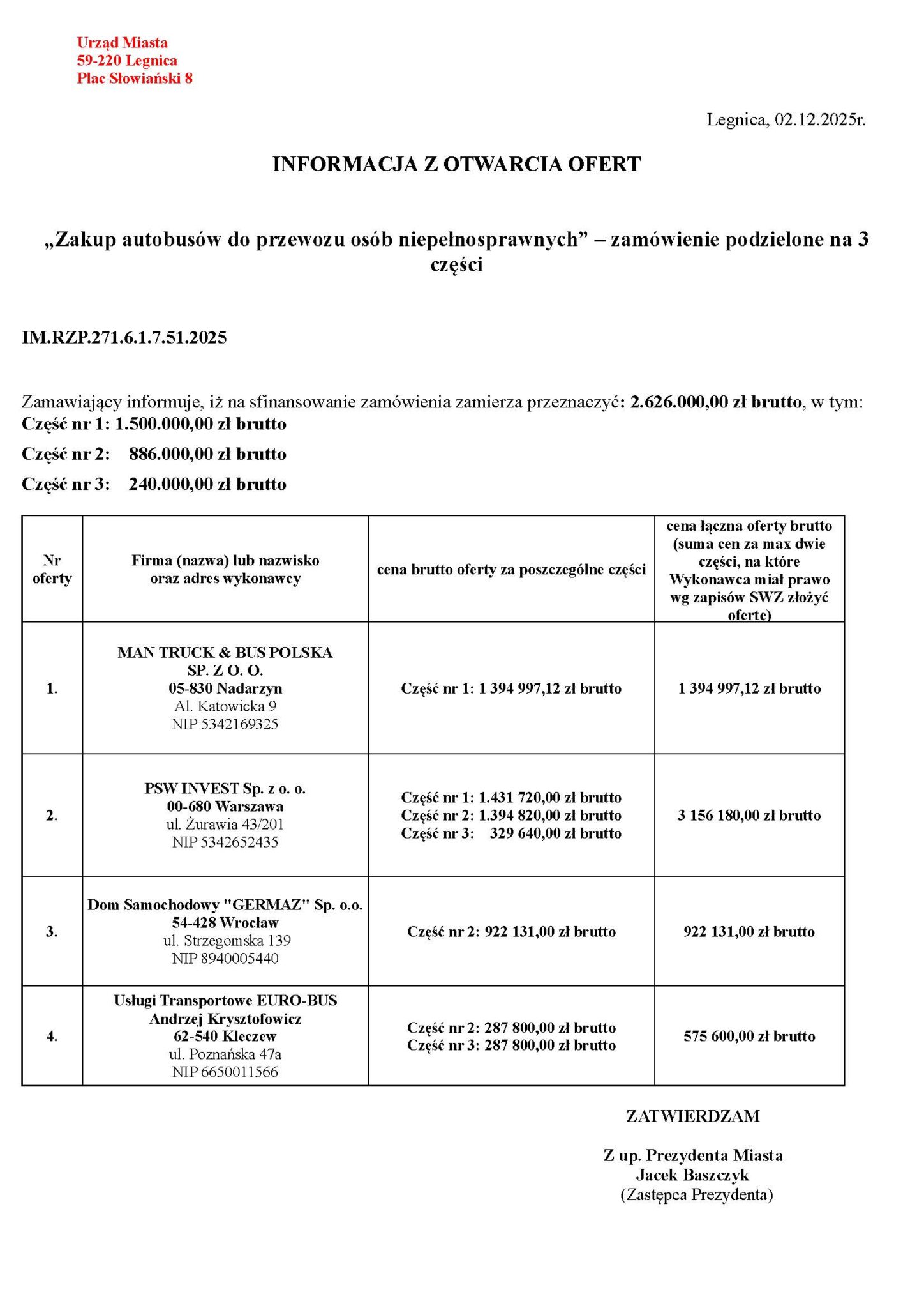 - Dom Samochodowy GERMAZ Sp. z o.o. złożył ofertę na 922.131,00 PLN brutto, czyli 749.699,19 PLN netto, a więc 249.899,73 PLN netto za autobus.