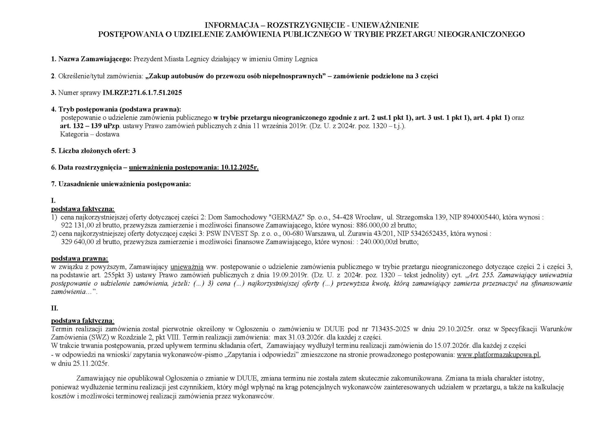 10 grudnia 2025 r. Urząd Miasta Legnicy unieważnił postępowanie na zakup autobusów i mikrobusa do przewozu osób z niepełnosprawnościami.