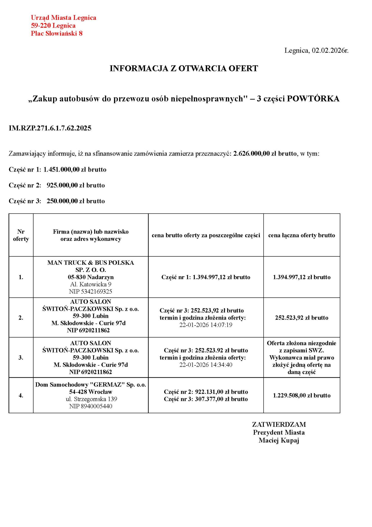 - W części 1 wpłynęła jedna oferta: MAN Truck & Bus Polska z ceną 1.394.997,12 PLN brutto, czyli 1.134.144,00 PLN netto, co daje cenę jednostkową netto za minibus MAN TGE na poziomie 378.048,00 PLN netto.