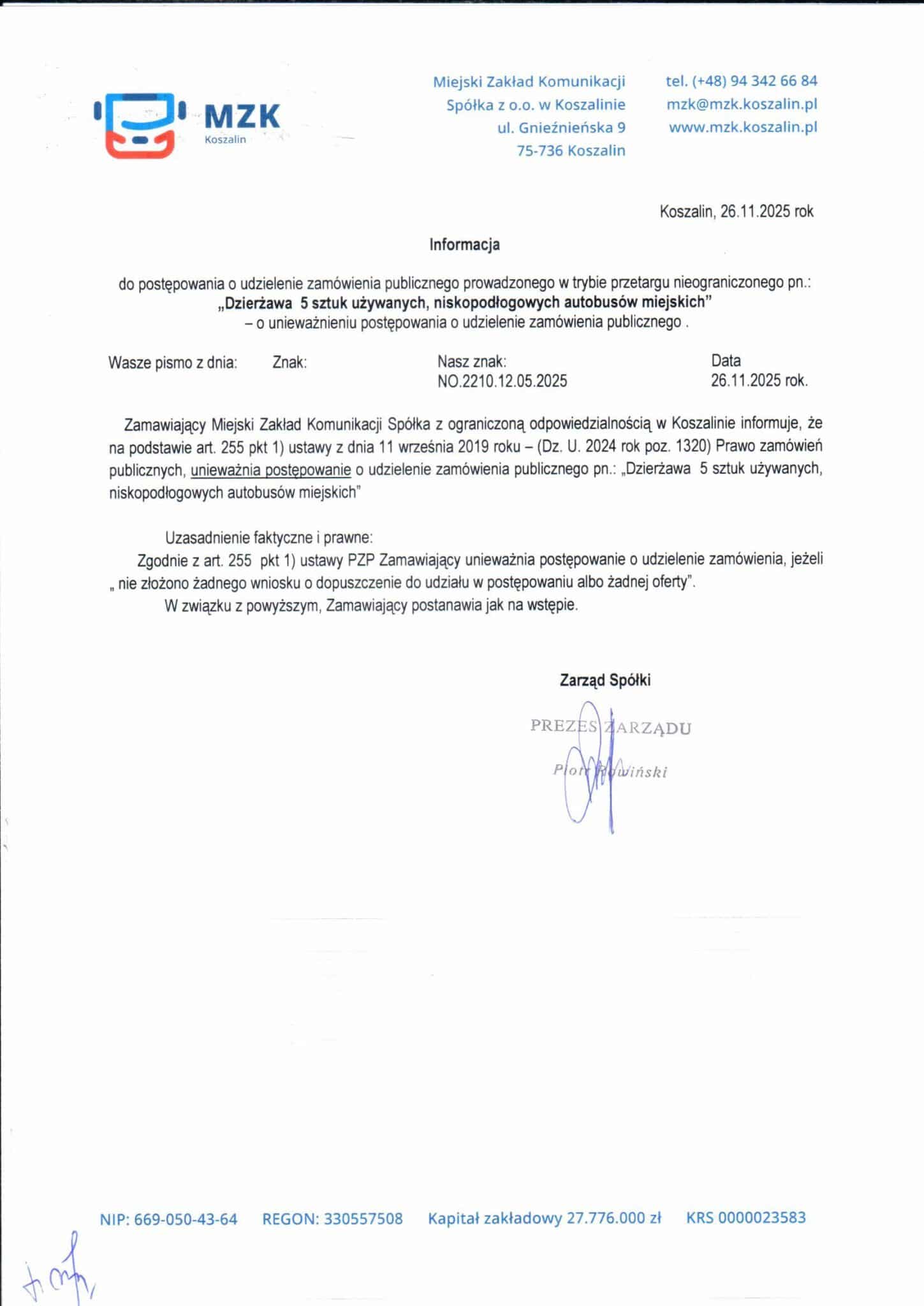 Równolegle MZK prowadził postępowanie na dzierżawę 5 używanych autobusów z rocznika 2020 wyposażonych w technologię Mild Hybrid. Tu jednak sytuacja wyglądała odwrotnie. Do dnia otwarcia ofert nie zgłosił się żaden wykonawca, co zmusiło zamawiającego do unieważnienia postępowania.
