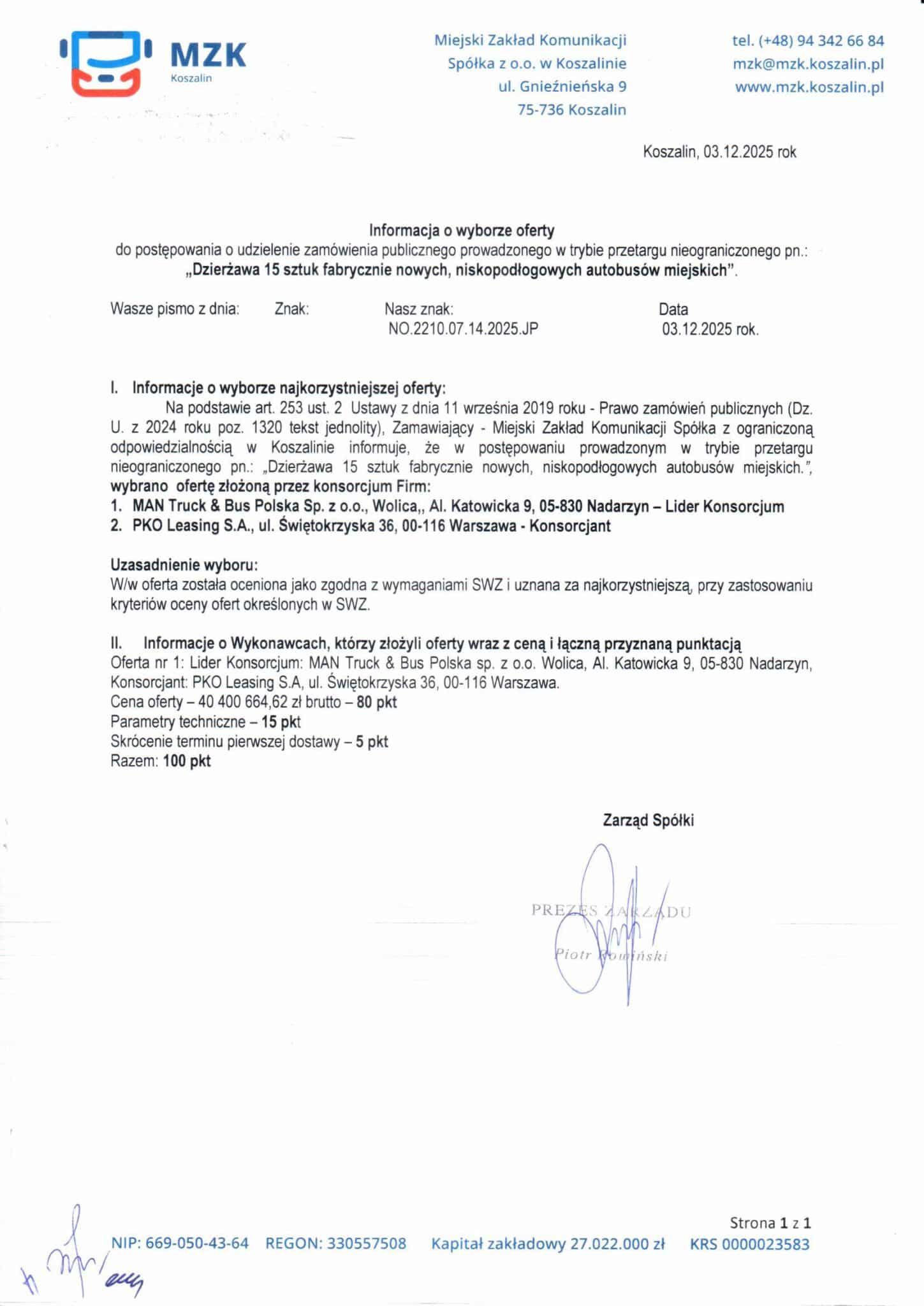 3 grudnia 2025 roku MZK Koszalin ogłosił wybór najkorzystniejszej oferty w przetargu na dzierżawę 15 fabrycznie nowych autobusów miejskich.