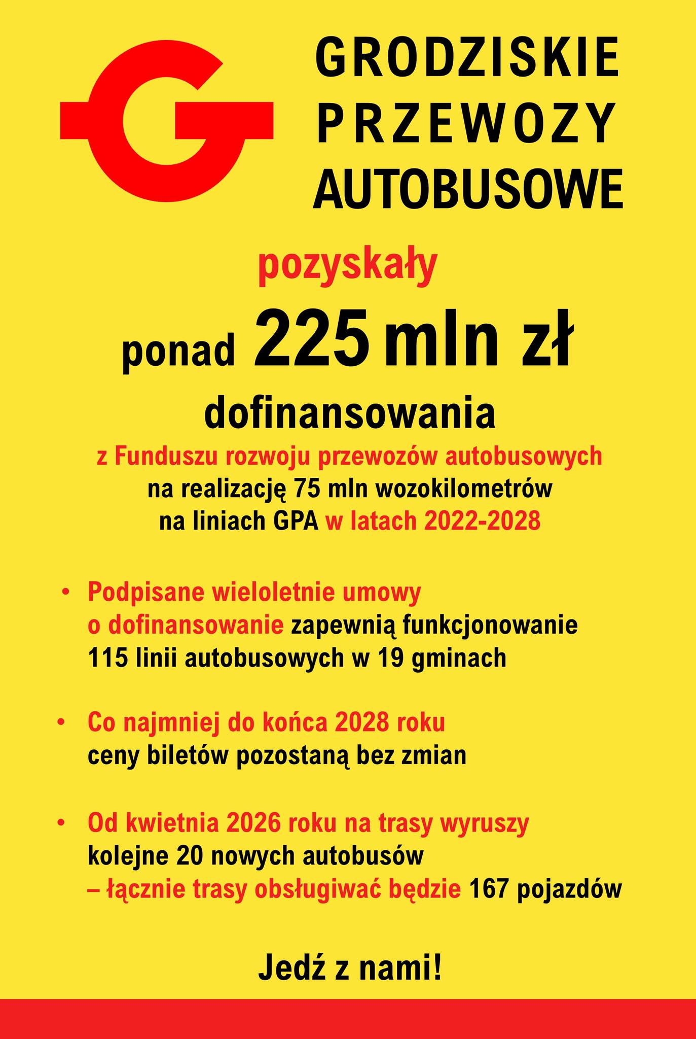 Jak poinformował zarząd związku, łącznie na lata 2026–2028 pozyskano 116 848 617,06 zł z Funduszu Rozwoju Przewozów Autobusowych. Od 2022 roku Grodziskie Przewozy Autobusowe zdobyły z Funduszu już ponad 225 mln zł na funkcjonowanie przewozów autobusowych.