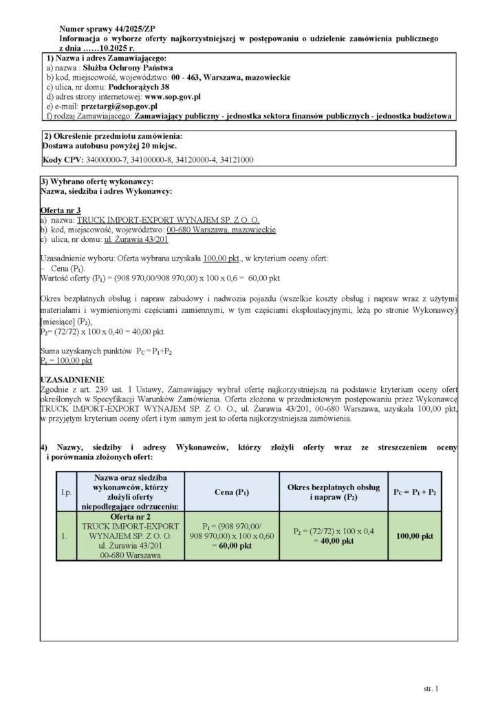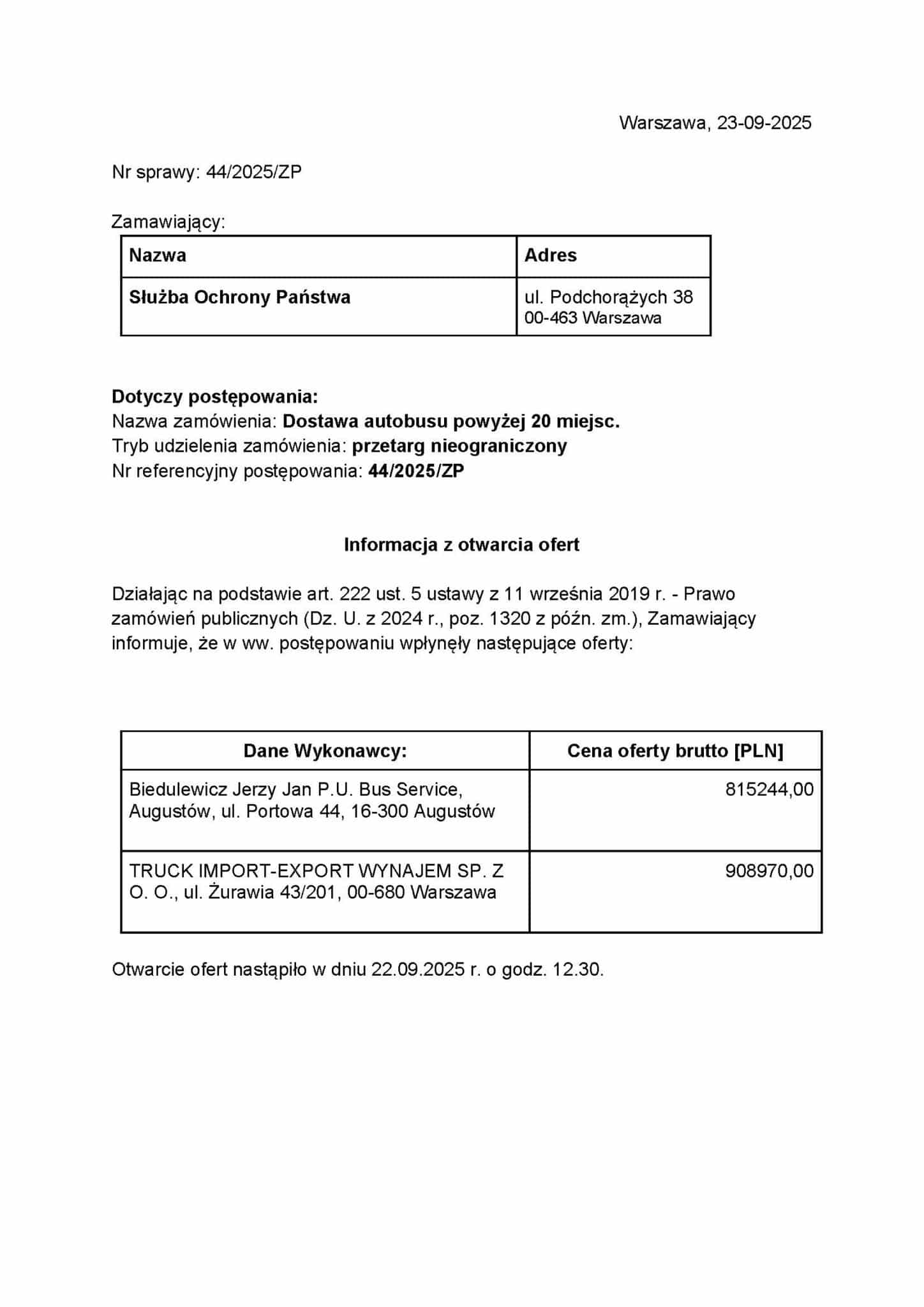 23 października 2025 r. Służba Ochrony Państwa poinformowała o wyborze najkorzystniejszej oferty w postępowaniu na dostawę autobusu powyżej 20 miejsc.