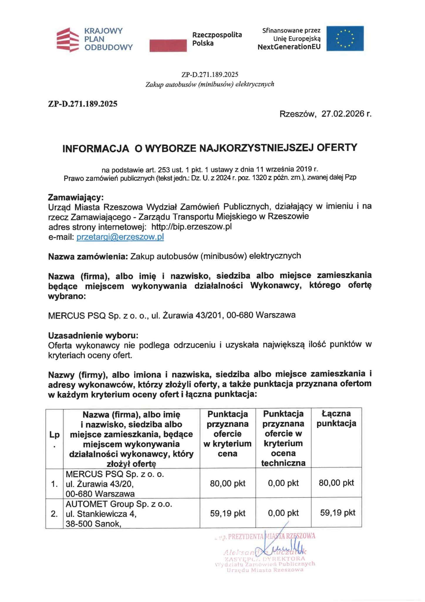 27 lutego 2026 r. Urząd Miasta Rzeszowa, działający w imieniu Zarządu Transportu Miejskiego w Rzeszowie, poinformował o wyborze najkorzystniejszej oferty w postępowaniu na zakup minibusów elektrycznych.