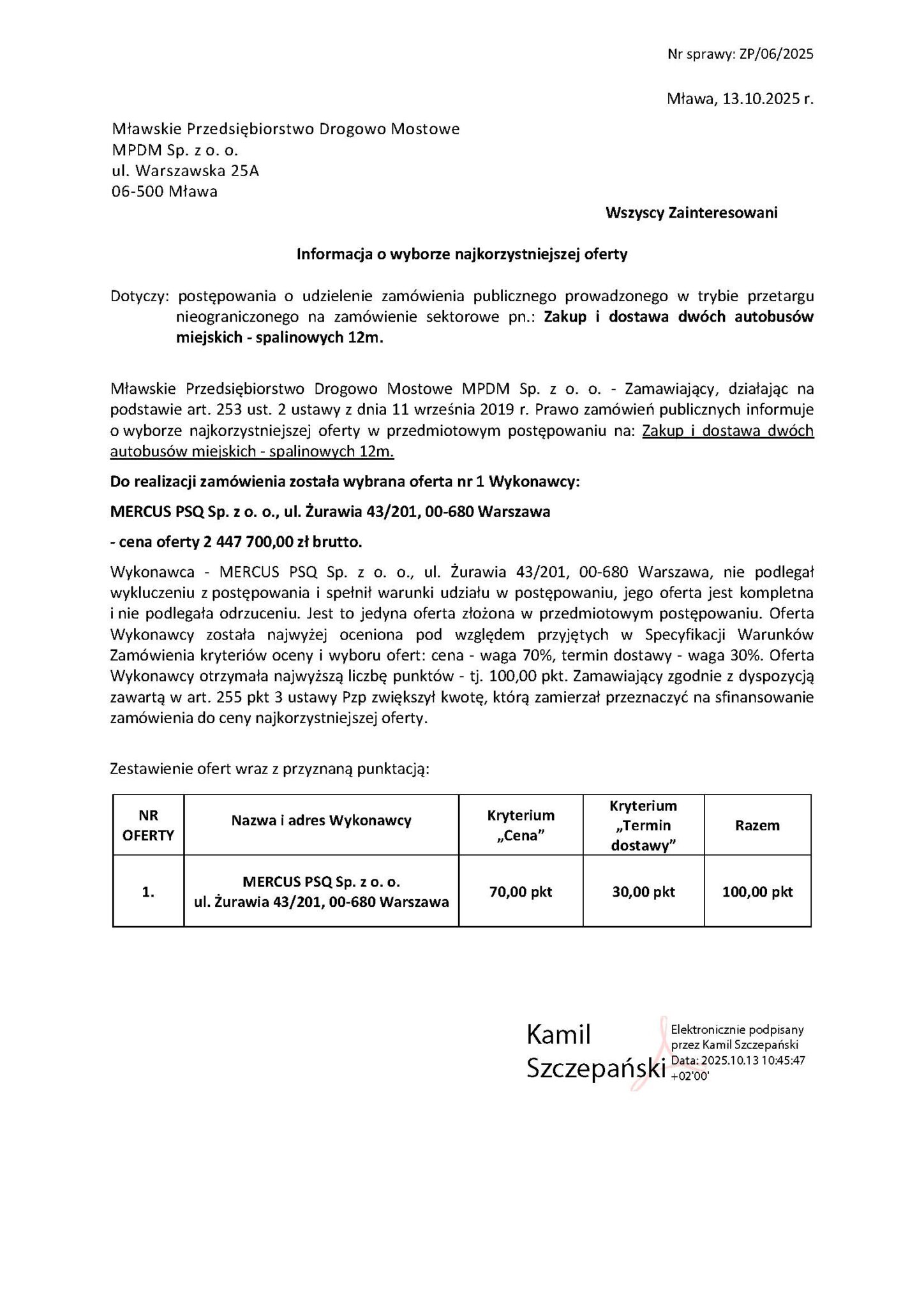 13 października 2025 r. ogłoszono wybór wykonawcy – zwycięzcą została firma Mercus PSQ Sp. z o.o. z Warszawy, która jako jedyna złożyła ofertę w postępowaniu. Z autobusami Güleryüz Ecoline 12. To debiut tej marki we flocie MPDM oraz pierwsze przetargowe zwycięstwo Mercusa z turecką marką. O tym zamówieniu pisaliśmy już wcześniej w TransInfo.