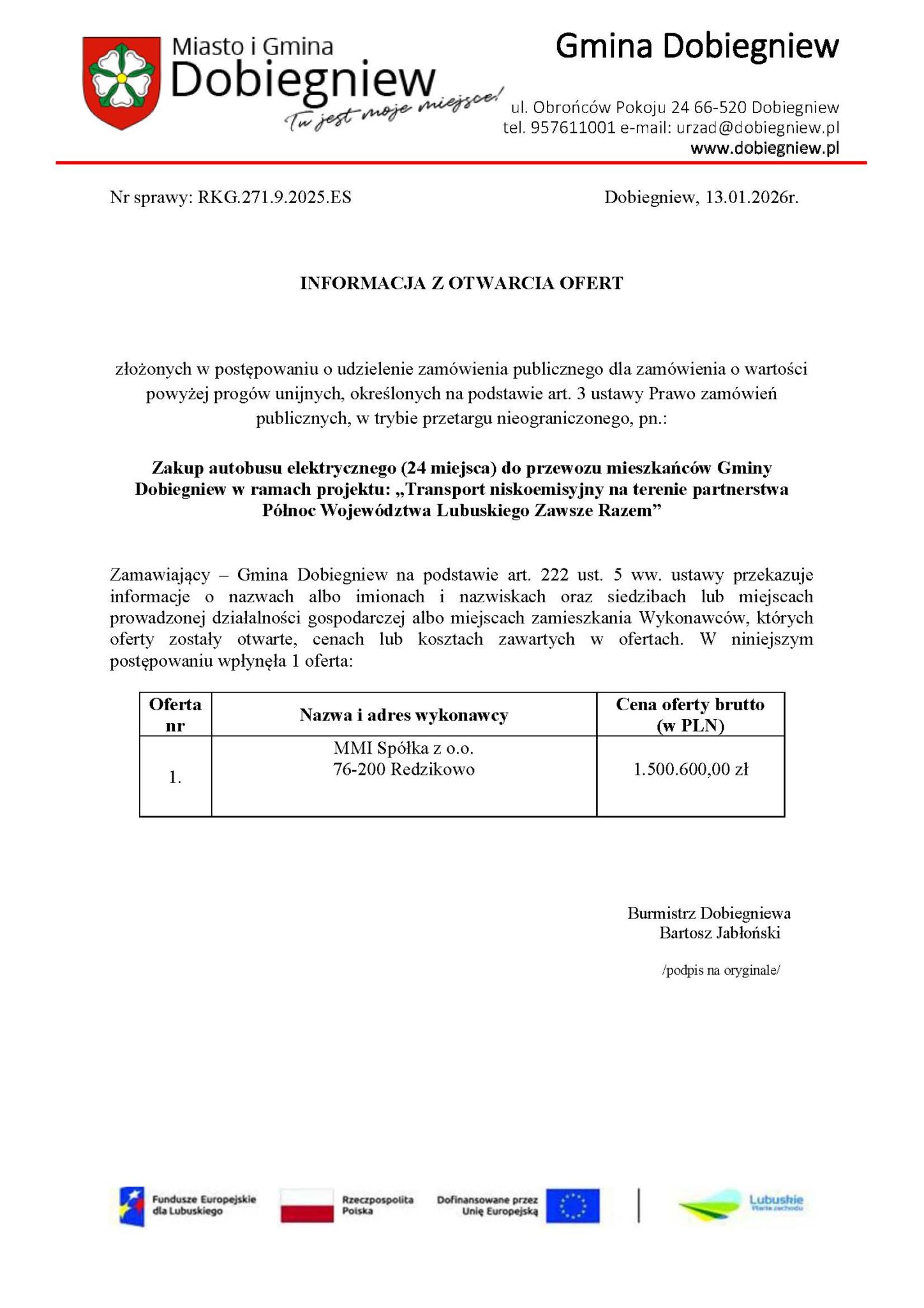 13 stycznia 2026 roku Gmina Dobiegniew poznała ofertę złożoną w przetargu na zakup autobusu elektrycznego do obsługi lokalnego transportu publicznego.