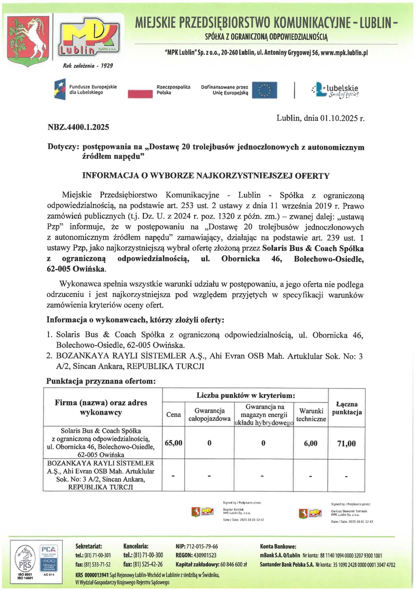 W postępowaniu wpłynęły dwie oferty. Najtańszą i jedyną ocenioną pozytywnie była propozycja od Solaris Bus & Coach, która zaproponowała realizację zamówienia za 68.830.800 PLN brutto / 55.960.000 PLN netto, co daje cenę jednostkową netto za Trollino 12 na poziomie – 2.798.000 PLN netto.