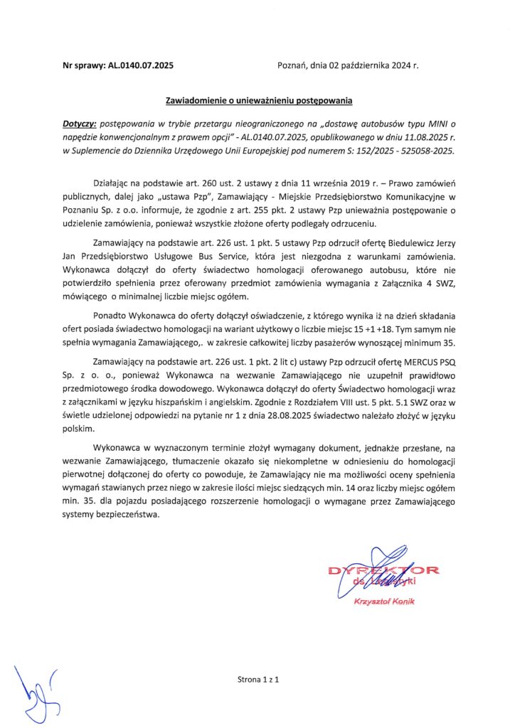 2 października 2025 roku MPK Poznań poinformowało o unieważnieniu postępowania przetargowego na dostawę autobusów typu MINI o napędzie konwencjonalnym.