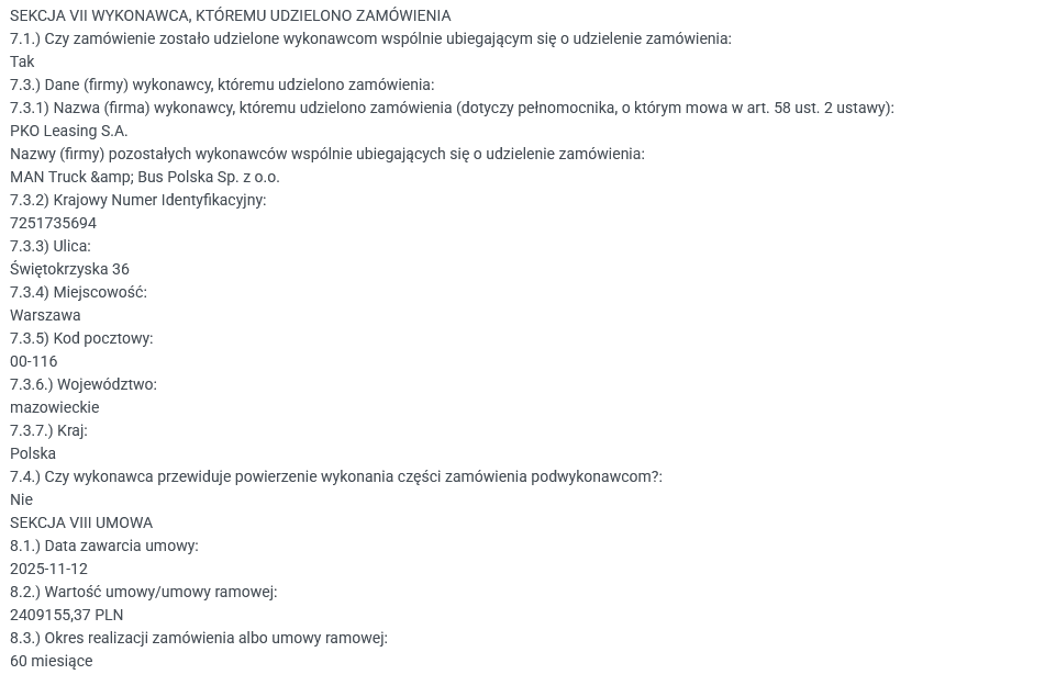 Z kolei kwota przewidziana na realizację zamówienia wynosiła 1.636.250 PLN brutto, co oznacza, że oferta była wyższa od szacunków o 772.905,37 PLN. Mimo to, MPK Radom zdecydowało się przyjąć ofertę i podpisać umowę – co było możliwe dzięki zastosowaniu formuły zapytania o wartość szacunkową leasingu, a nie pełnego przetargu z ograniczeniami budżetowymi.