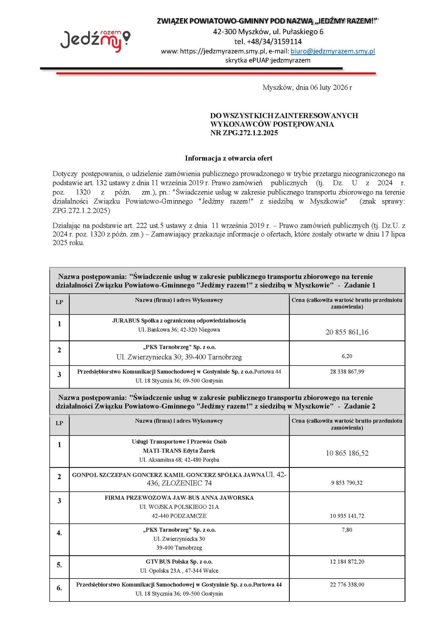 6 lutego 2026 roku w Myszkowie otwarto oferty w przetargu Związku Powiatowo-Gminnego „Jedźmy razem!”, dotyczącym obsługi autobusowych przewozów pasażerskich.