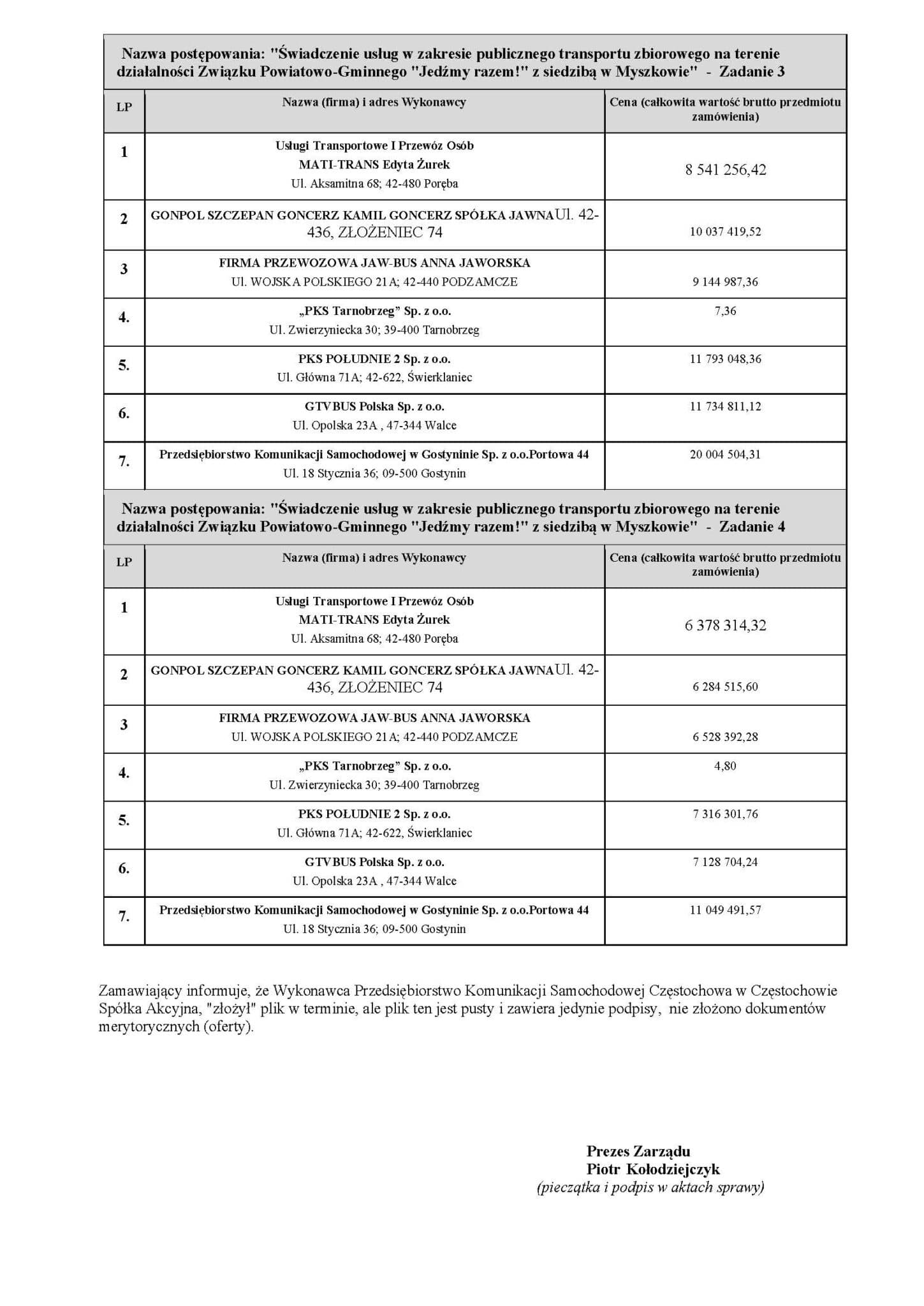 - Firma przewozowa Jaw-Bus Anna Jaworska – 10.935.141,72 PLN brutto, 10.125.131,22 PLN netto, co oznacza 3,15 PLN netto za 1 wzkm.