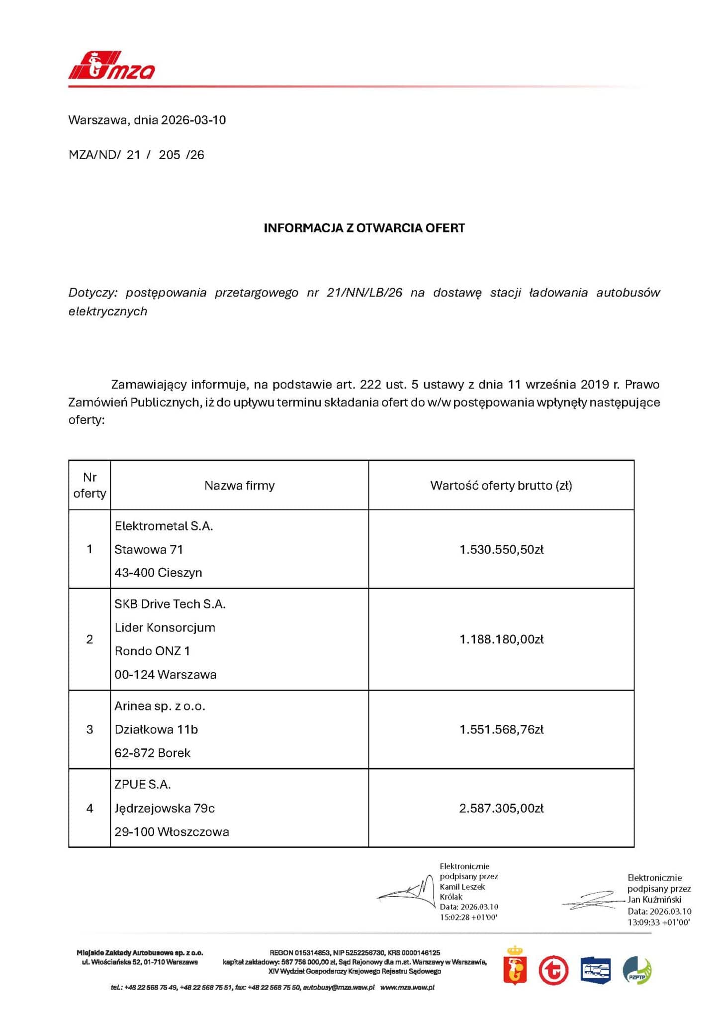 Do postępowania przetargowego nr 21/NN/LB/26 wpłynęły cztery oferty od firm działających na rynku infrastruktury elektroenergetycznej i ładowania pojazdów elektrycznych.
