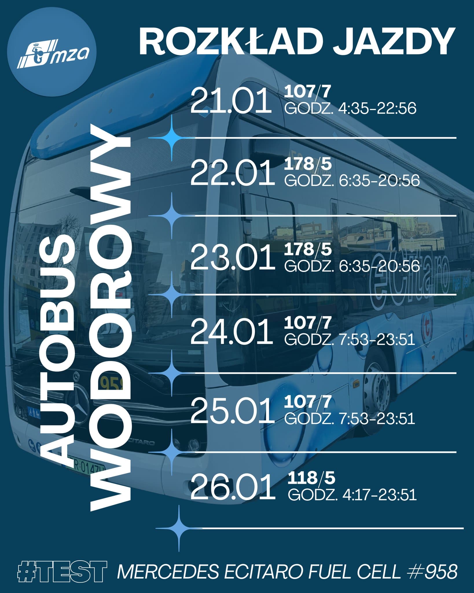 Pojazd udostępniła firma Daimler Buses Polska, która ma sobą serię wodorowych testów w całym kraju plus dwa pierwsze zamówienia. 21 stycznia autobus marki Mercedes-Benz pojawi się na regularnych trasach Warszawskiego Transportu Publicznego i będzie woził pasażerów w ramach normalnej pracy przewozowej. Poniżej linie, na których będzie można spotkać tego niezwykłego wodorowca. Jako ciekawostkę można podać fakt, że pierwsze pojazdy H2 do MZA miał dostarczyć … Arthur Bus.