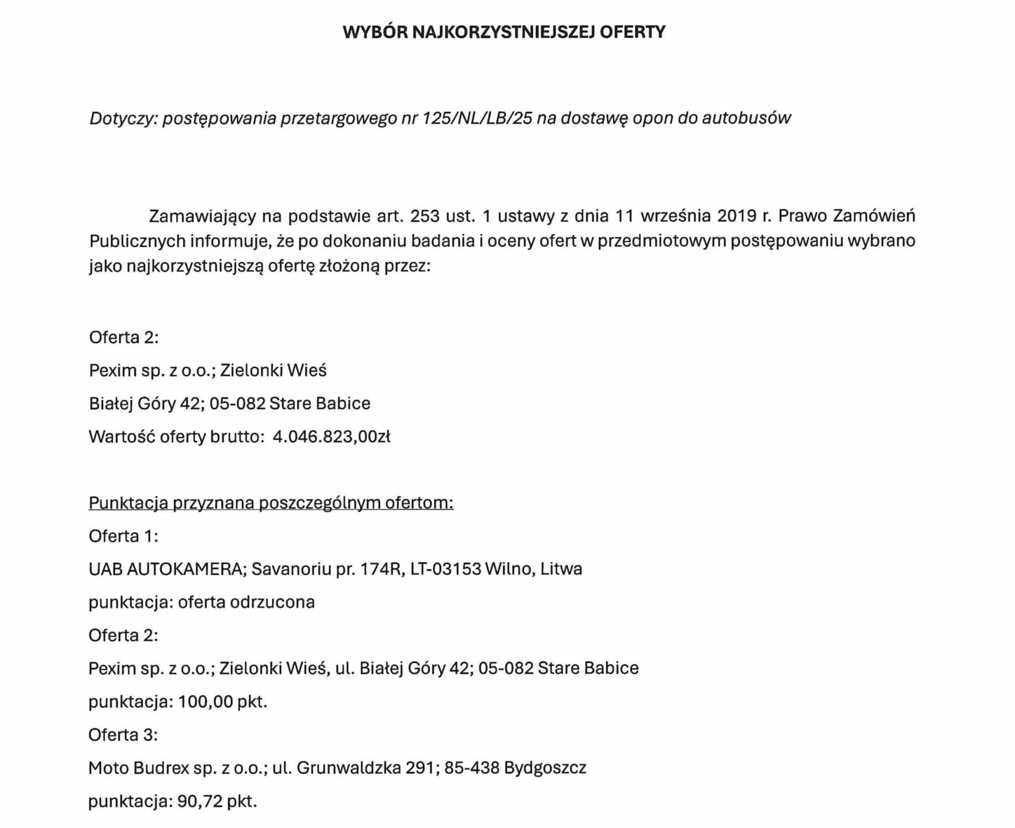 Różnica pomiędzy ofertą najtańszą a najdroższą wyniosła ponad 414.000 PLN brutto, co przy tak dużym wolumenie przekłada się na realne oszczędności w kosztach eksploatacji autobusów. Dlatego oferta Pexim sp. z o.o. uzyskała 100,00 pkt., jako najtańsza spośród ofert niepodlegających odrzuceniu. Propozycja Moto Budrex sp. z o.o. otrzymała 90,72 pkt., co wynikało bezpośrednio z wyższej ceny brutto. Oferta UAB Autokamera została odrzucona, więc nie była klasyfikowana w końcowym rankingu.