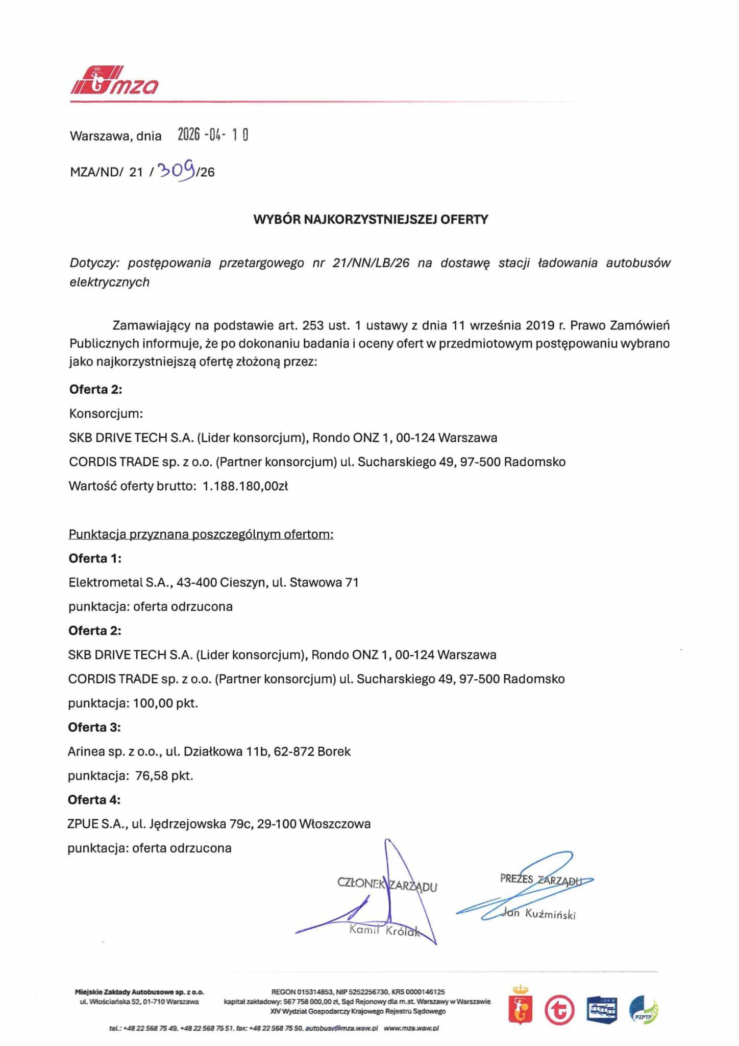 10 kwietnia 2026 roku Miejskie Zakłady Autobusowe w Warszawie wybrały najkorzystniejszą ofertę w przetargu na dostawę stacji ładowania dla autobusów elektrycznych.