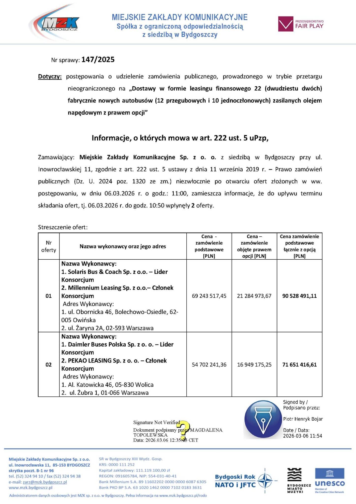 Do upływu terminu składania ofert, czyli 6 marca 2026 roku do godziny 10:50, wpłynęły dwie propozycje przygotowane przez konsorcja producentów autobusów i firm leasingowych.