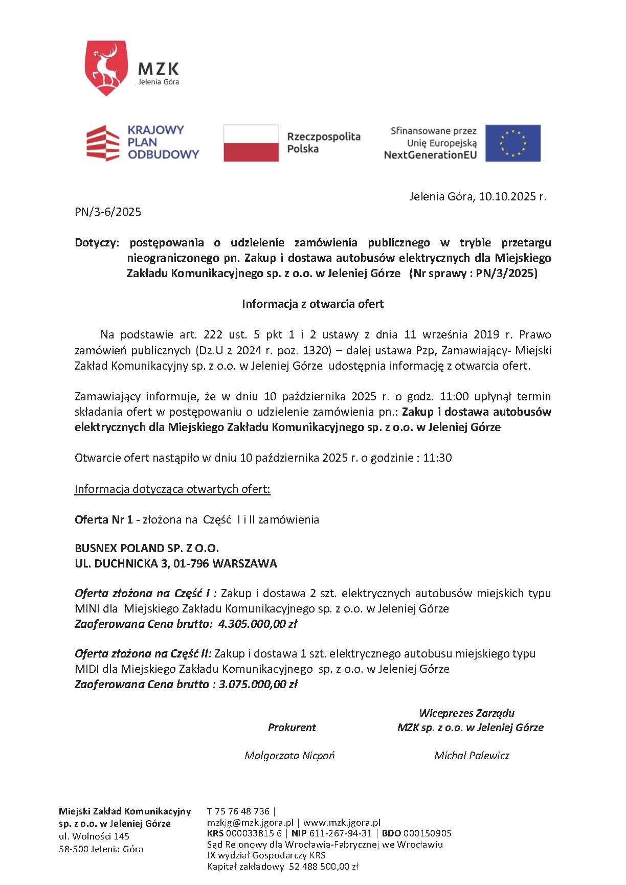 - Dla Części I (MINI) Busnex zaoferował dostawę dwóch autobusów elektrycznych o łącznej cenie 4.305.000 PLN brutto, co odpowiada 3.500.000 PLN netto, czyli 1.750.000 PLN netto za jeden autobus elektryczny.