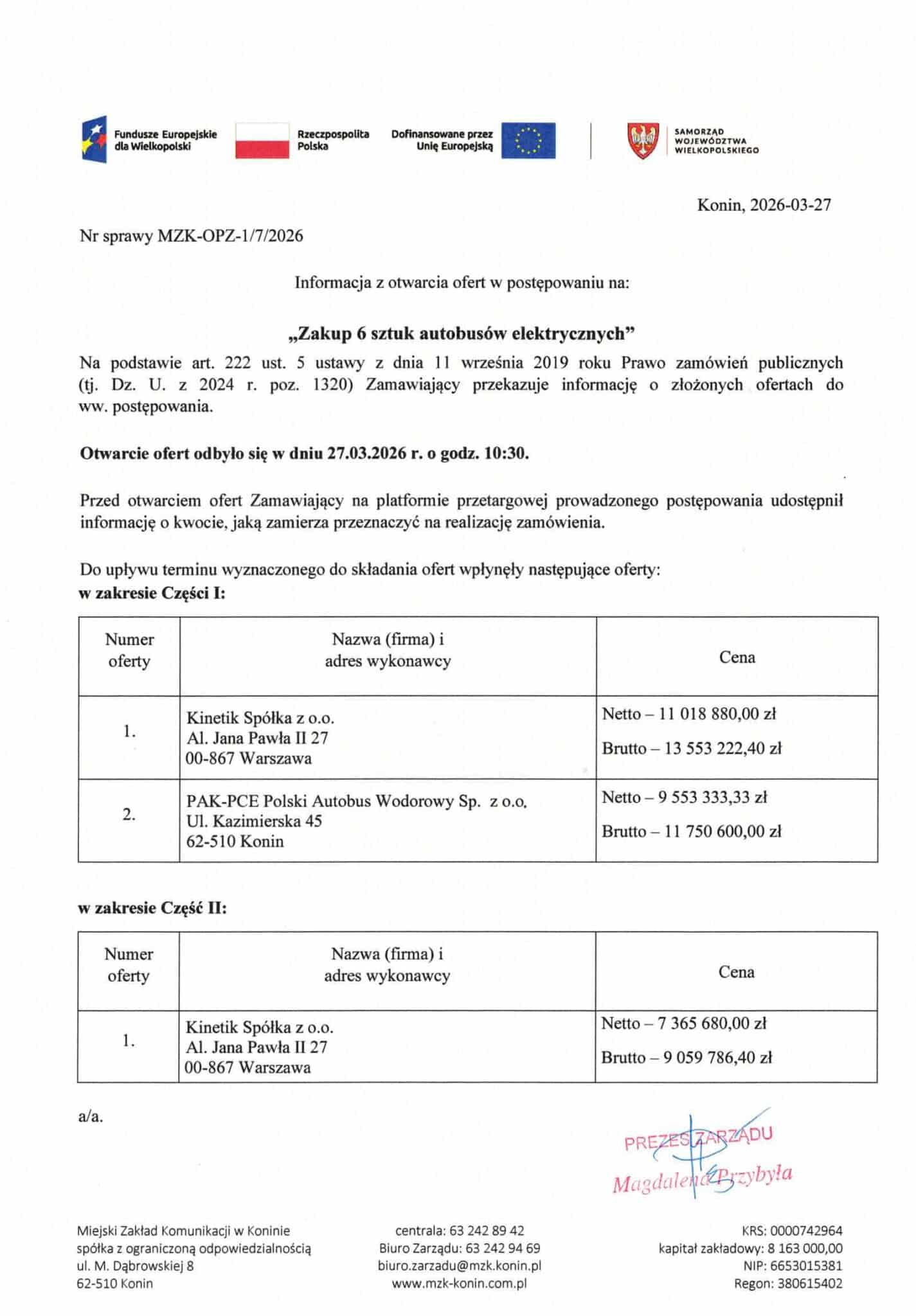 Z kolei propozycja Kinetik oznacza cenę jednostkową na poziomie 2.754.720,00 PLN netto i 3.388.305,60 PLN brutto za Karsan e-ATA 12 , przy łącznej wartości 11.018.880,00 PLN netto / 13.553.222,40 PLN brutto.