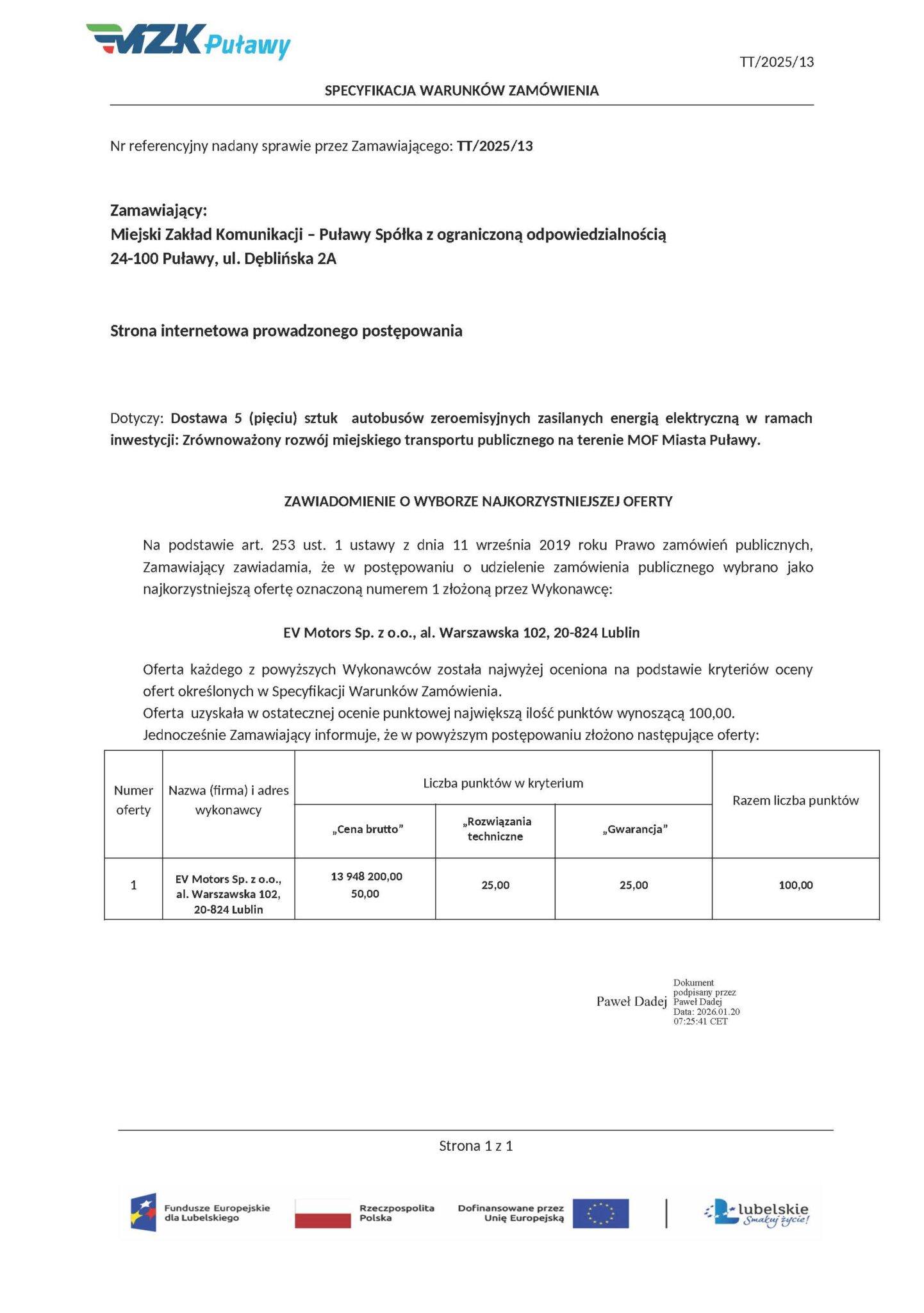Zakup jest realizowanej w ramach inwestycji „Zrównoważony rozwój miejskiego transportu publicznego na terenie MOF Miasta Puławy”. Decyzja o wyborze najkorzystniejszej oferty – czyli propozycji EV Motors z autobusami chińskiej marki King Long – zapadła 23 stycznia 2026 roku. Zamawiający wskazał, że zwycięska propozycja spełnia wymagania SWZ i uzyskała najwyższą liczbę punktów w ocenie końcowej. O tym zamówieniu pisaliśmy już wcześniej w TransInfo.
