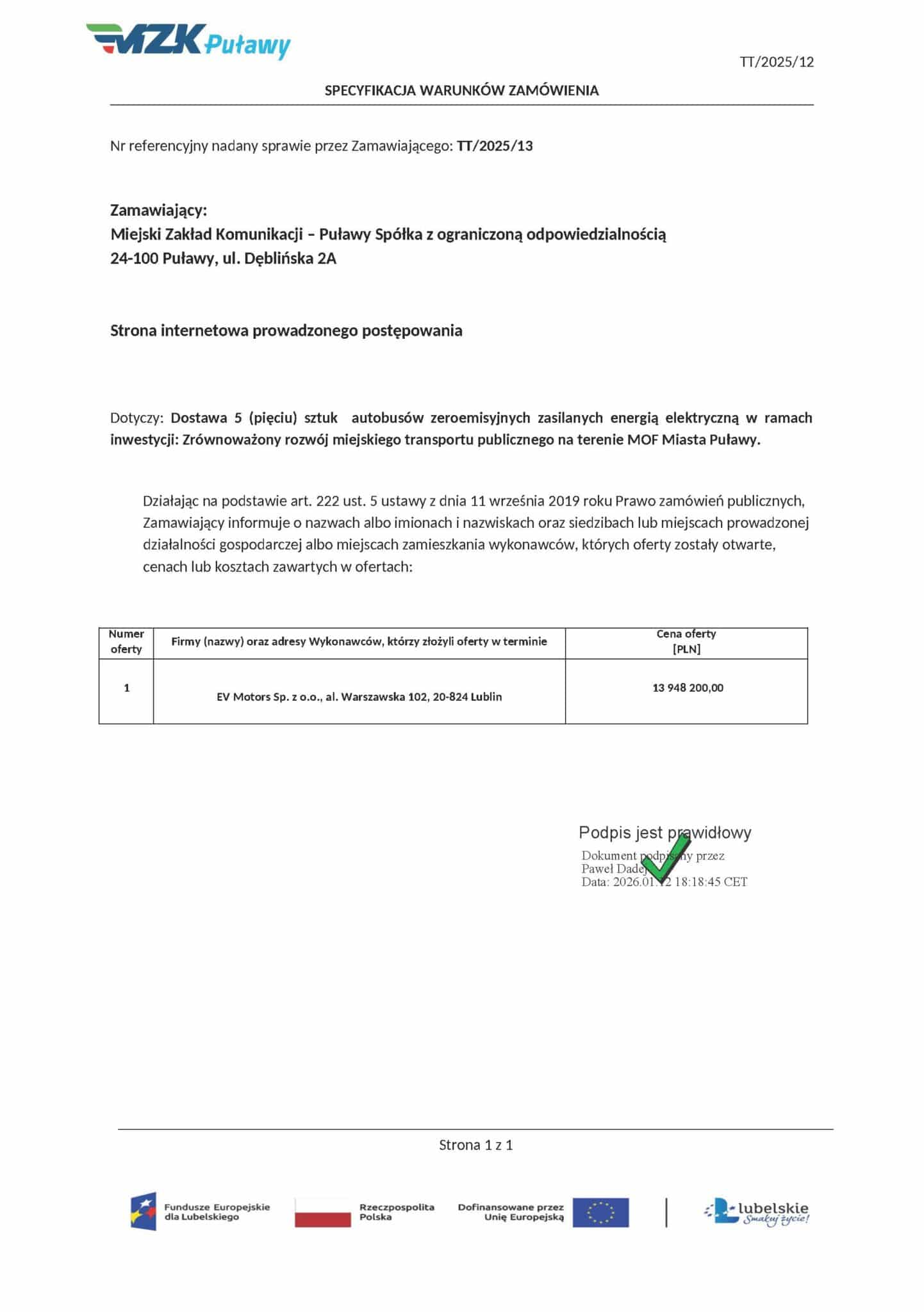 W wyznaczonym terminie wpłynęła jedna oferta, złożona przez EV Motors Sp. z o.o. z Lublina (wart opodkreslić, że bez finansowego konsorcjum z Busnex Wilno). Wartość oferty wynosi 13.948.200 PLN brutto, co przy stawce VAT 23% odpowiada kwocie 11.340.000 PLN netto. Przy założeniu dostawy pięciu autobusów elektrycznych oznacza to, że cena jednostkowa netto za jeden autobus elektryczny(MIDI/MAXI) kształtuje się na poziomie 2.268.000 PLN netto, a cena jednostkowa brutto wynosi 2.789.640 PLN. Zaproponowane pojazdy to znany z Krosna PEV9 plus PEV12, które w ramach pierwszego zamówienia MZK przyjadą do Puław już w przyszłym miesiącu. Czyli można w tym przypadku mówić o unifikacji floty.