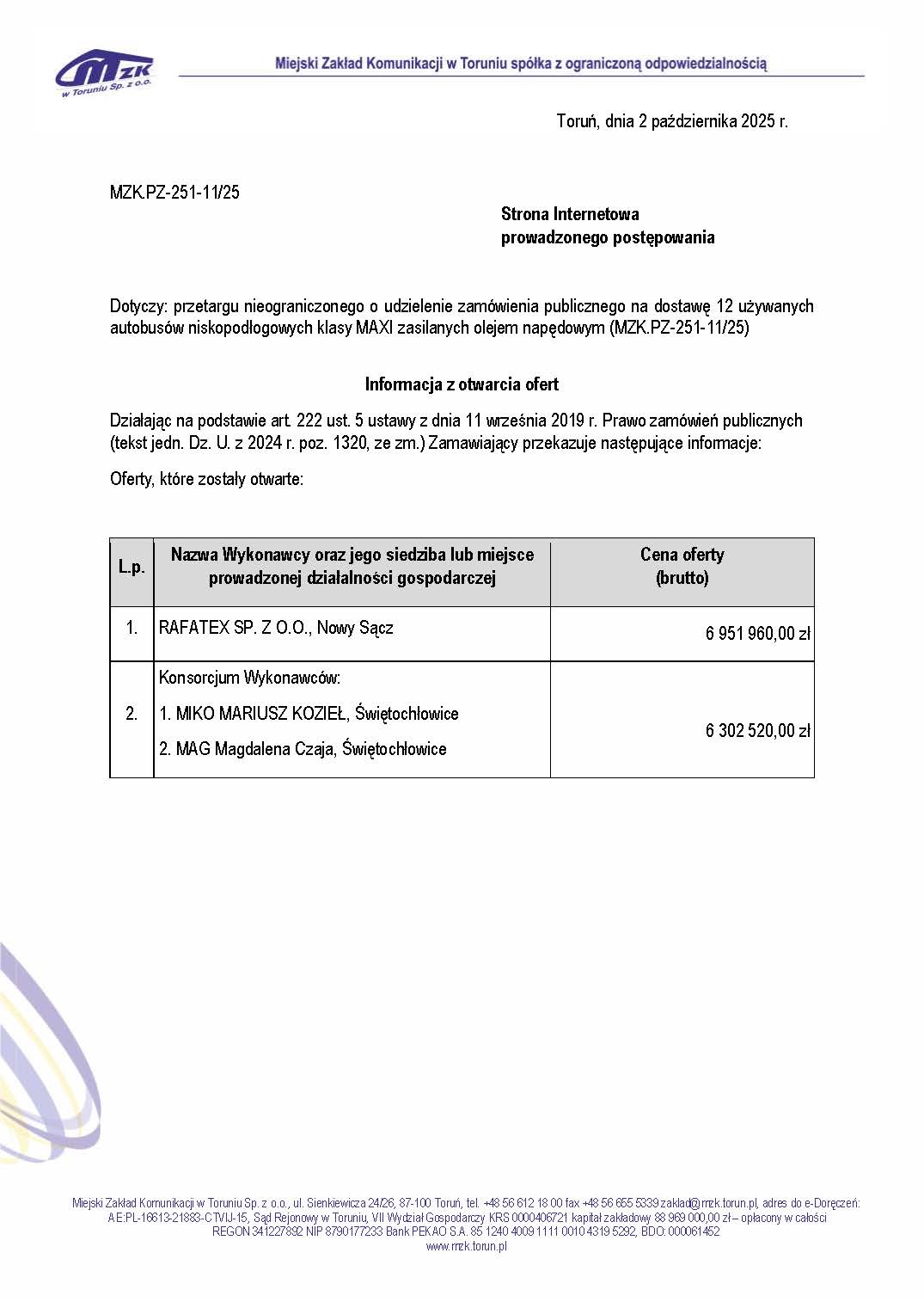 Szczegółowe informacje o zamówieniu na: https://mzk-torun.ezamawiajacy.pl/pn/mzk-torun/demand/244910/notice/public/details