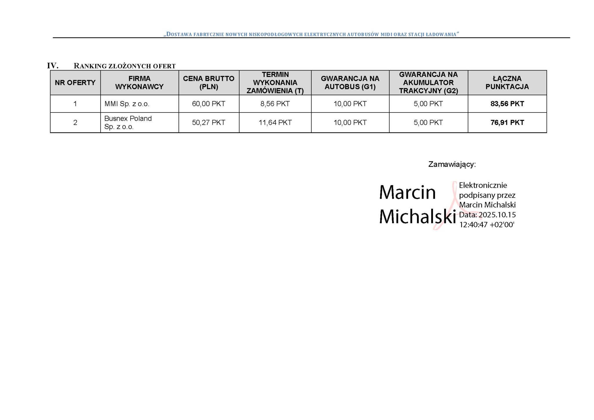 Zamawiający podkreślił, że MMI spełniło wszystkie warunki udziału w postępowaniu, a jego oferta uzyskała 83,56 pkt w ocenie, wobec 76,91 pkt zdobytych przez Busnex. O ostatecznym zwycięstwie zdecydowała przede wszystkim niższa cena oraz korzystniejszy termin realizacji. Decyzja zamawiającego została podjęta zgodnie z kryteriami oceny ofert: