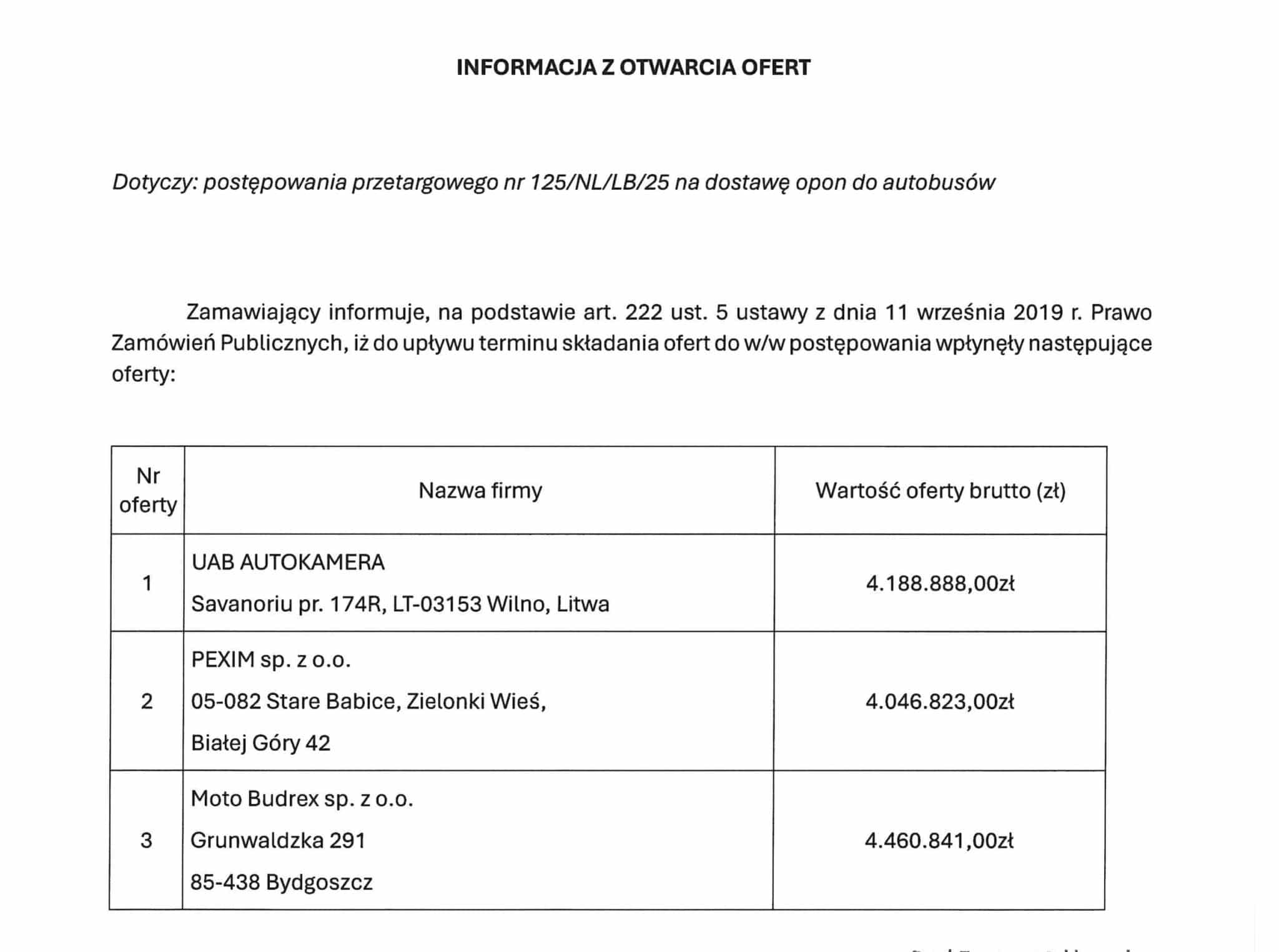 - Druga w kolejności była oferta UAB Autokamera z Wilna, opiewająca na 4.188.888,00 PLN brutto, czyli 3.405.600,00 PLN netto. W tym przypadku cena jednostkowa netto jednej opony wynosi 1.032 PLN, co oznacza wyraźnie wyższy koszt w przeliczeniu na pojedynczy autobus.