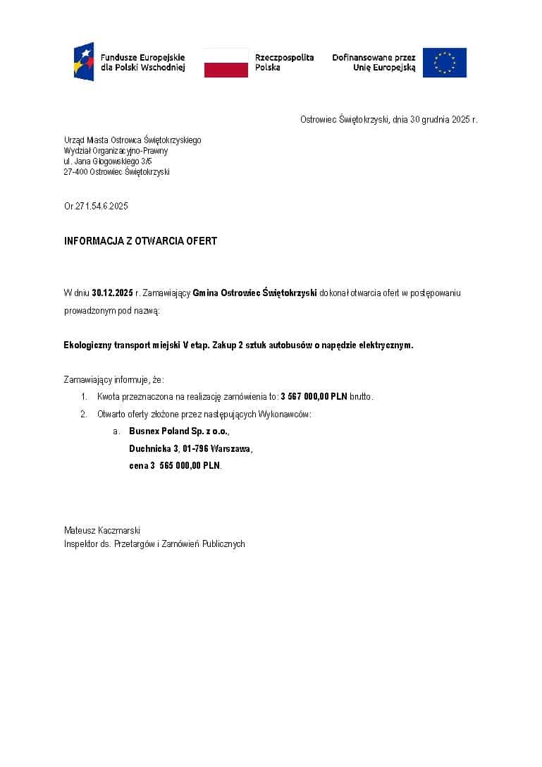 30 grudnia 2025 roku Gmina Ostrowiec Świętokrzyski dokonała otwarcia ofert w postępowaniu na zakup dwóch autobusów elektrycznych w ramach projektu „Ekologiczny transport miejski V etap”.