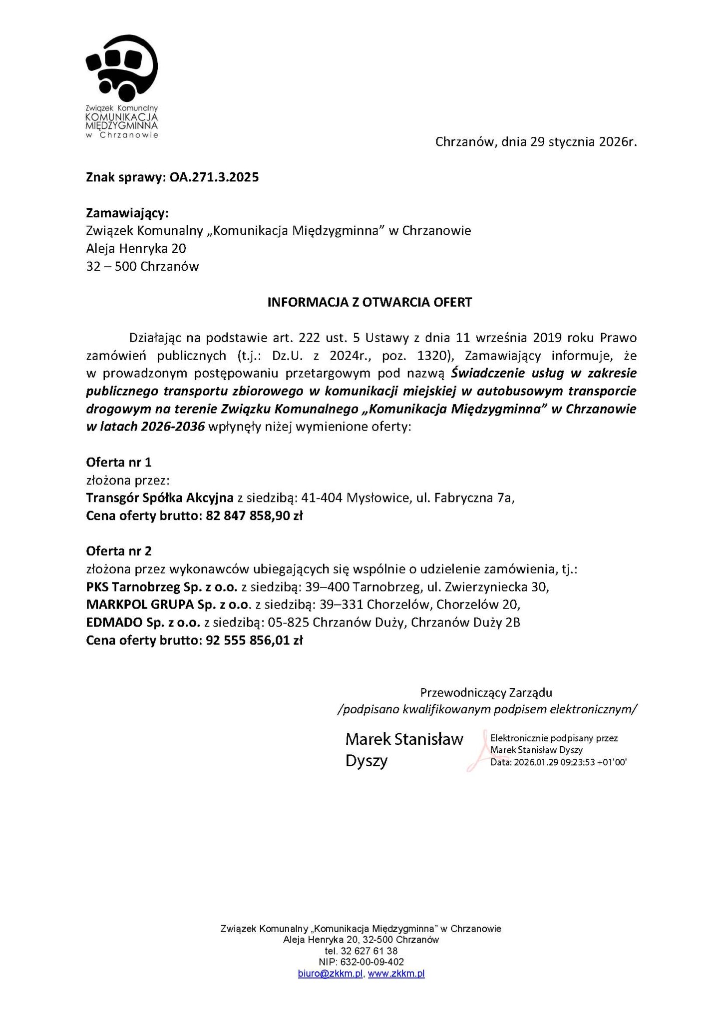 29 stycznia 2026 roku Związek Komunalny „Komunikacja Międzygminna” w Chrzanowie oficjalnie otworzył oferty w ponowionym przetargu na wieloletnią obsługę komunikacji miejskiej autobusami na terenie związku.