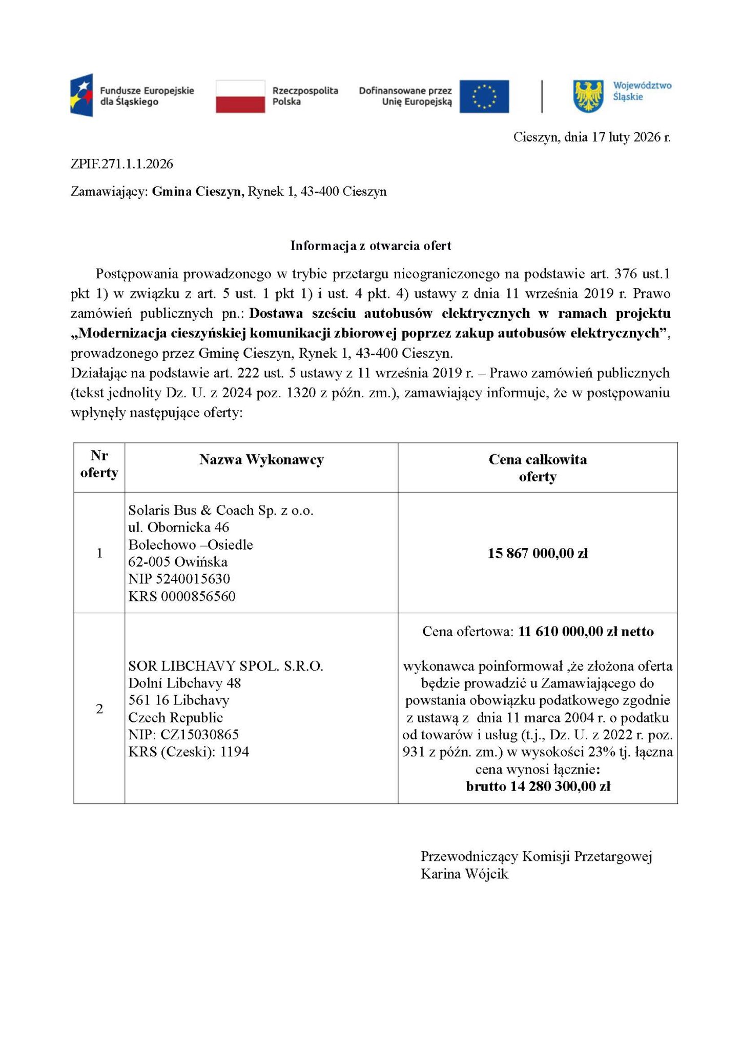17 lutego 2026 r. w Cieszynie otwarto oferty w przetargu na dostawę sześciu autobusów elektrycznych w ramach projektu „Modernizacja cieszyńskiej komunikacji zbiorowej poprzez zakup autobusów elektrycznych”.