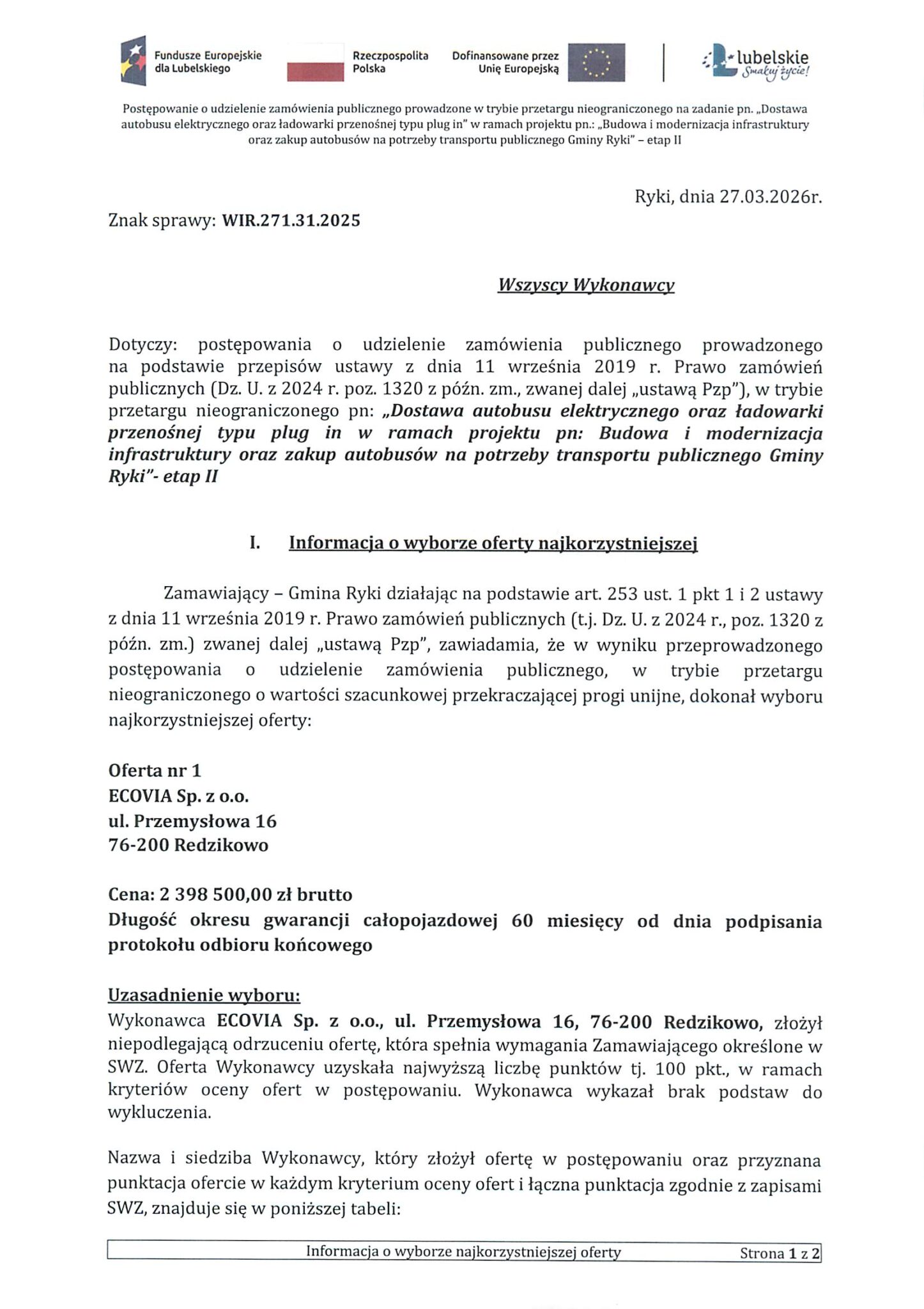 27 marca 2026 roku Gmina Ryki poinformowała o wyborze najkorzystniejszej oferty w przetargu na dostawę pierwszego autobusu elektrycznego.