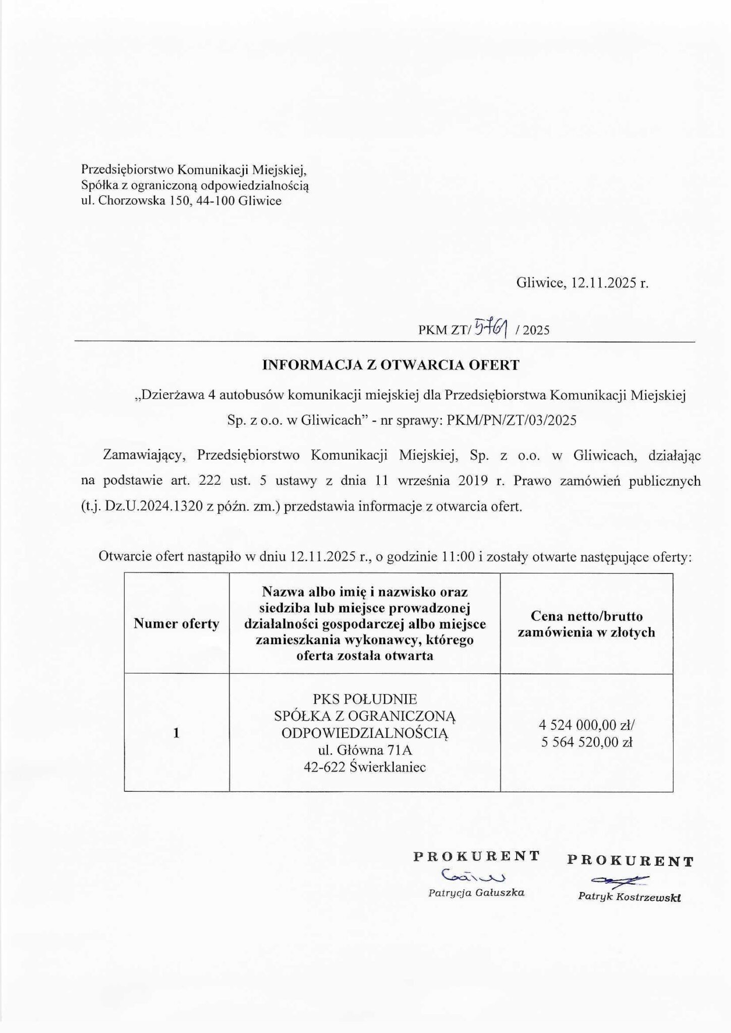 12 listopada 2025 r. Przedsiębiorstwo Komunikacji Miejskiej w Gliwicach otworzyło oferty w postępowaniu o nazwie „Dzierżawa 4 autobusów komunikacji miejskiej”.