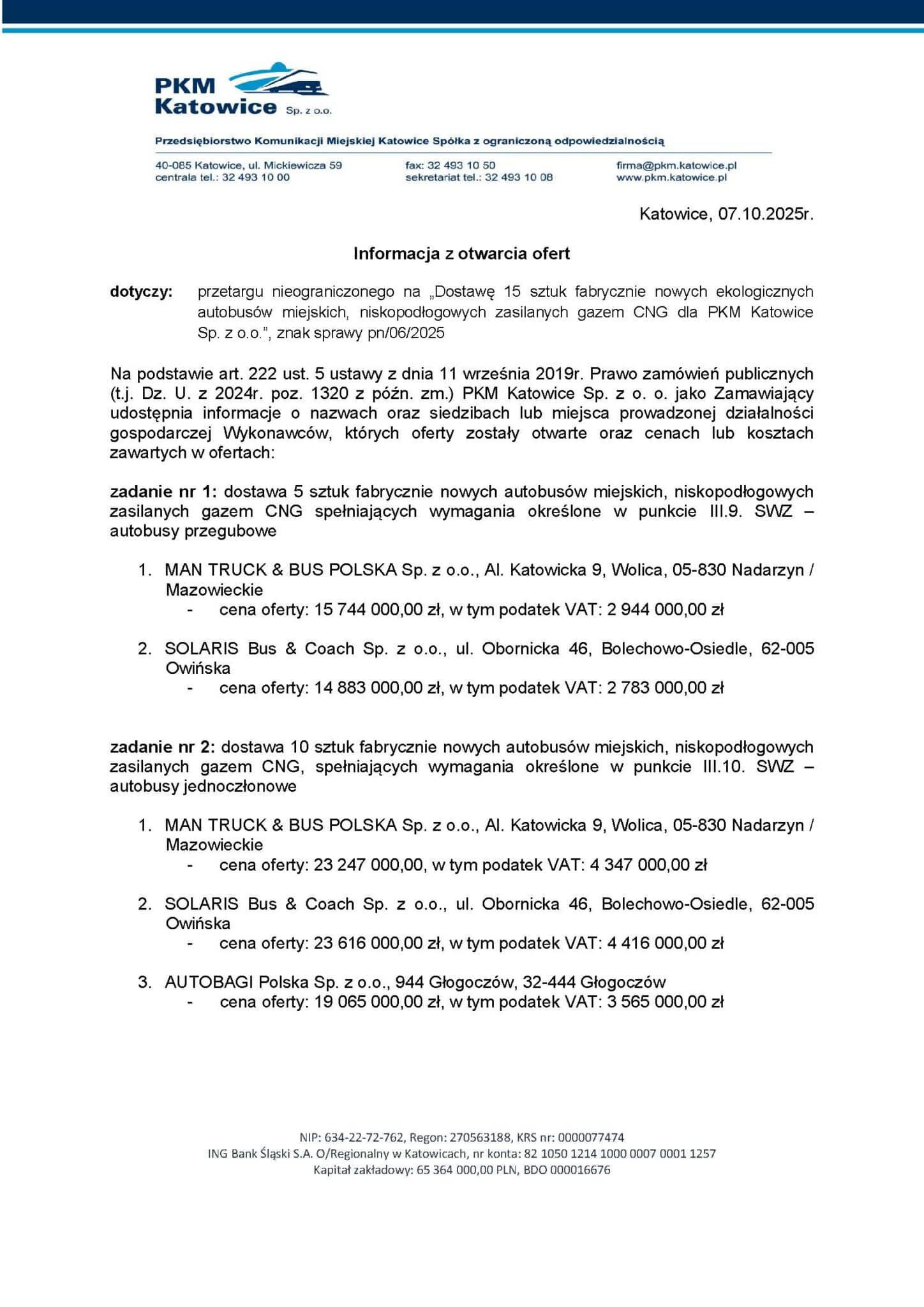 - MAN Truck & Bus Polska zaproponował cenę 15.744.000 PLN brutto, czyli 12.800.000 PLN netto,
