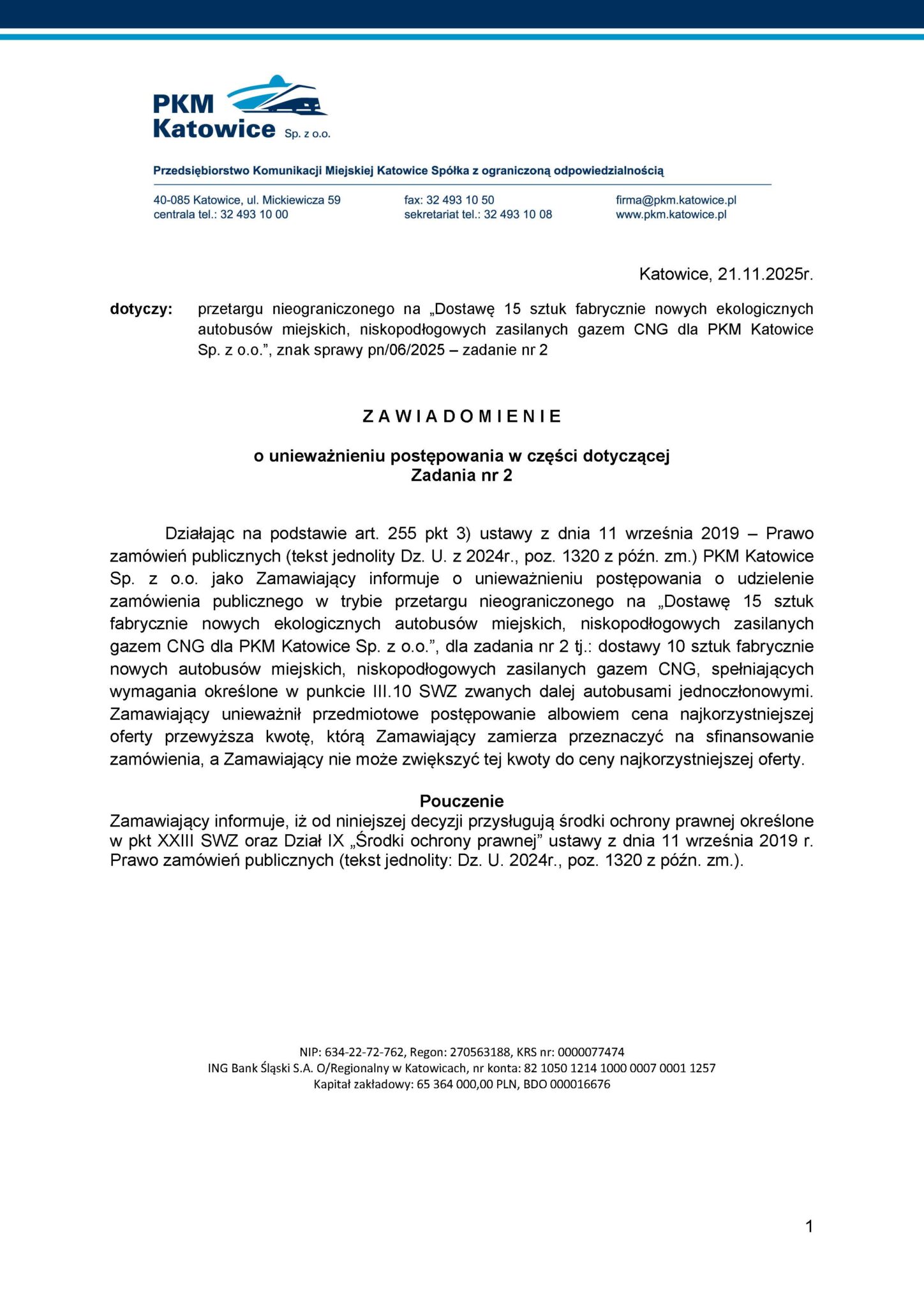 21 listopada 2025 r. Przedsiębiorstwo Komunikacji Miejskiej w Katowicach poinformowało o unieważnieniu postępowania w zakresie zakupu 15 autobusów zasilanych CNG.