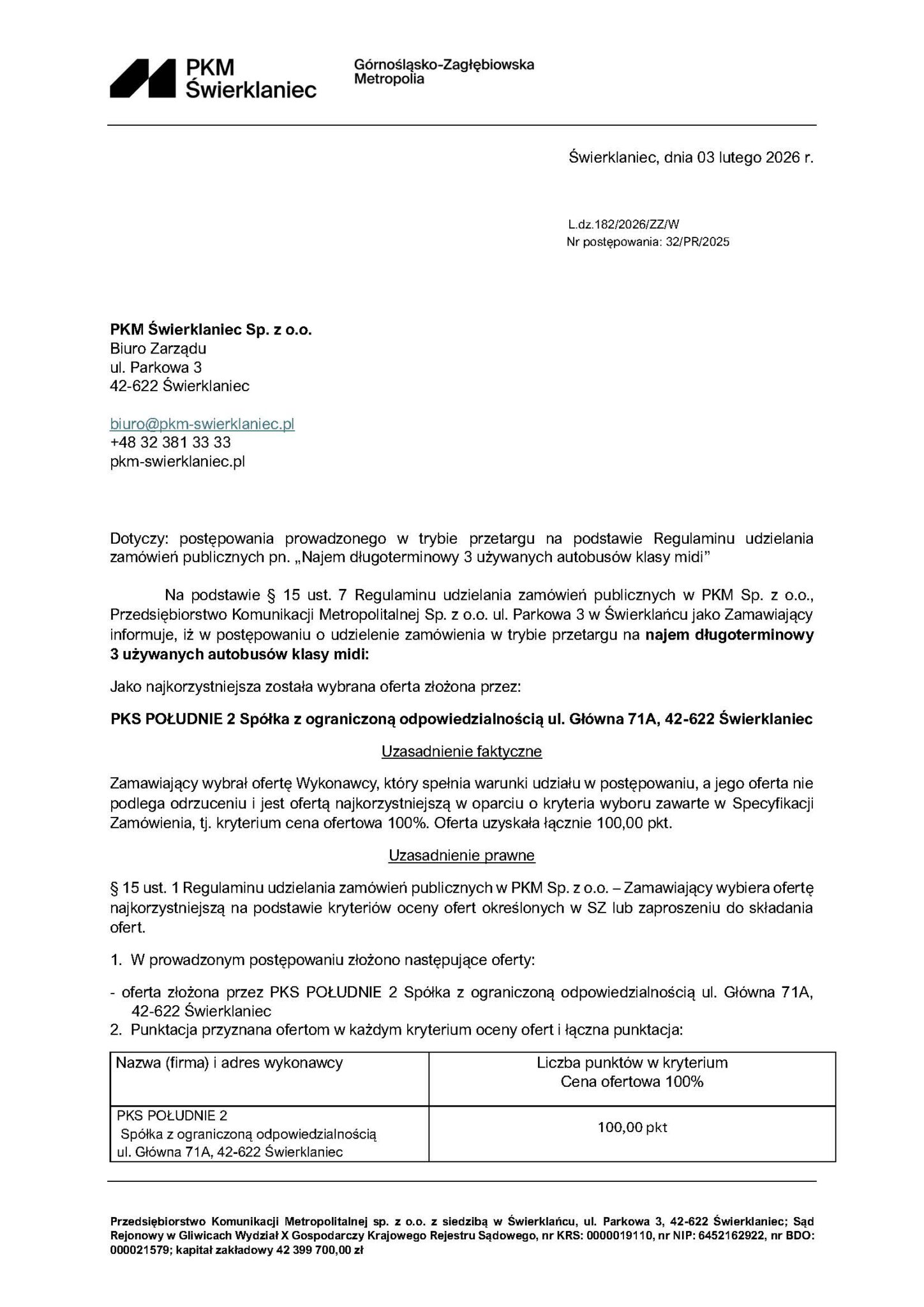 Jedyną ofertę złożyła PKS Południe 2, proponując 1.475.852 PLN brutto / 1.199.879 PLN netto, co daje cenę jednostkową netto za jeden autobus na poziomie – 599.939 PLN netto. W tym zamówienie podstawowe wynosi 1.461.240 PLN brutto, a prawo opcji 14.612 PLN brutto.