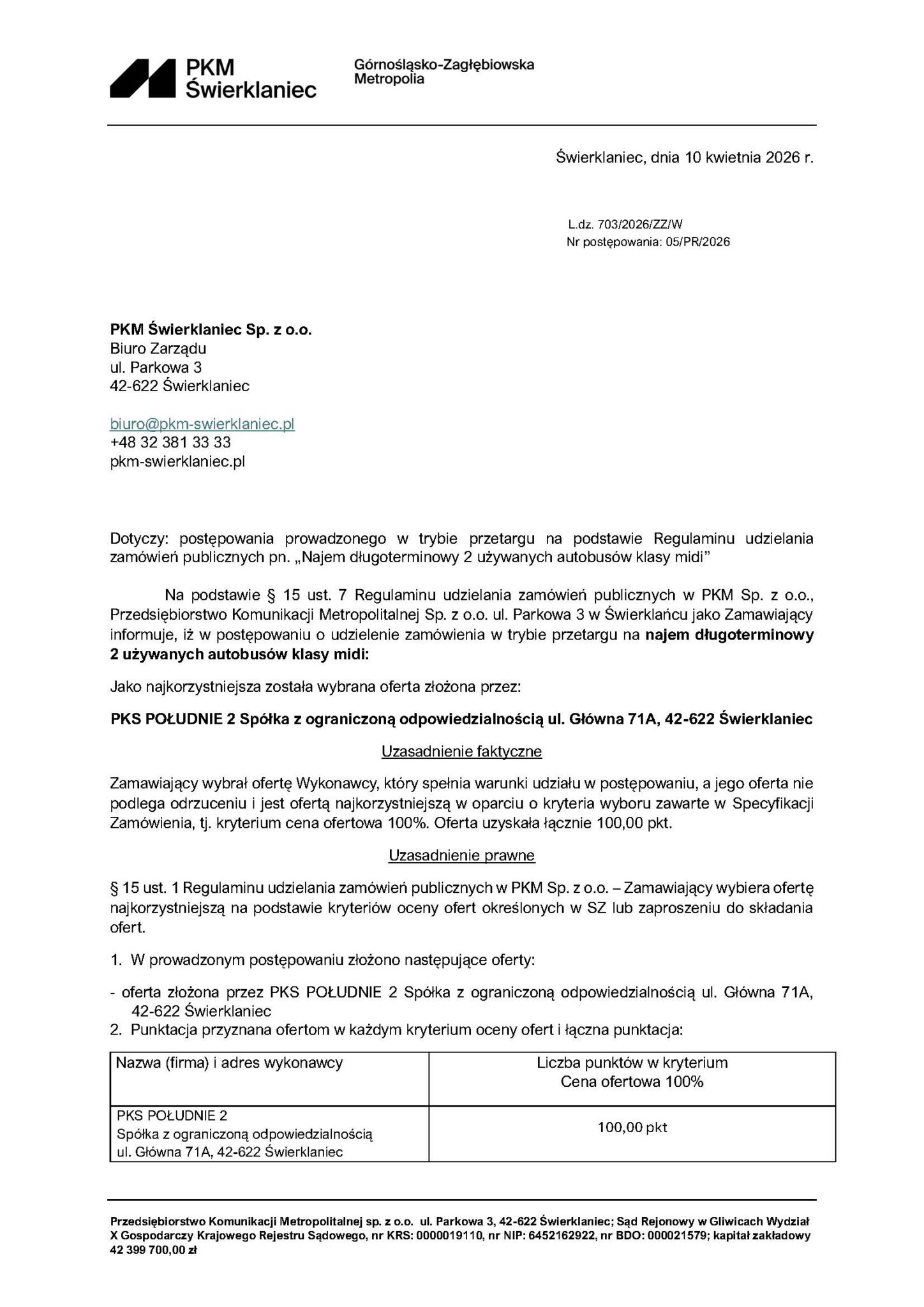 10 kwietnia 2026 roku Przedsiębiorstwo Komunikacji Metropolitalnej w Świerklańcu wybrało najkorzystniejszą ofertę na najem autobusów dla transportu publicznego.