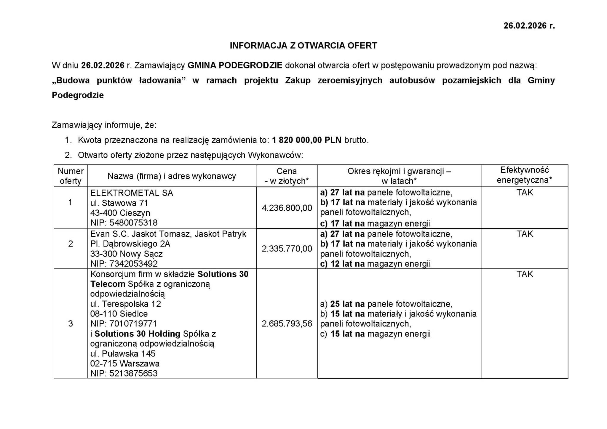 26 lutego 2026 r. Gmina Podegrodzie dokonała otwarcia ofert w przetargu na „Budowę punktów ładowania” w ramach projektu zakupu zeroemisyjnych autobusów pozamiejskich.