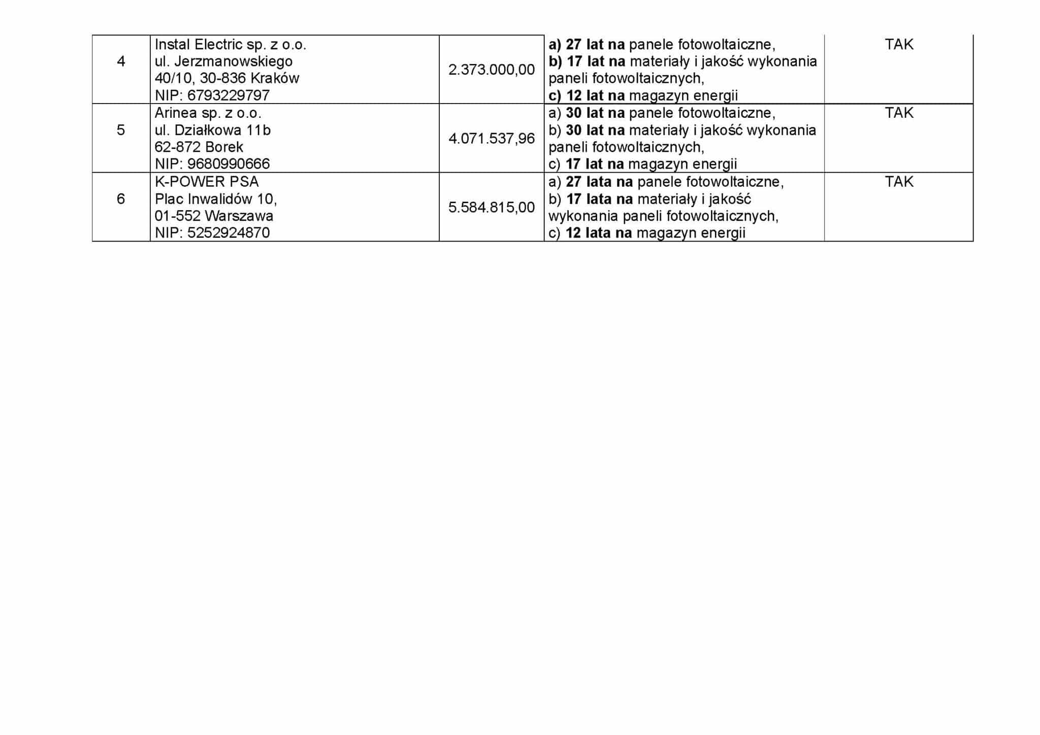 - Najwyższą cenę przedstawił K-Power PSA – 5.584.815,00 PLN brutto / 4.540.500,00 PLN netto, co daje cenę jednostkową netto na poziomie – 908.100,00 PLN netto.