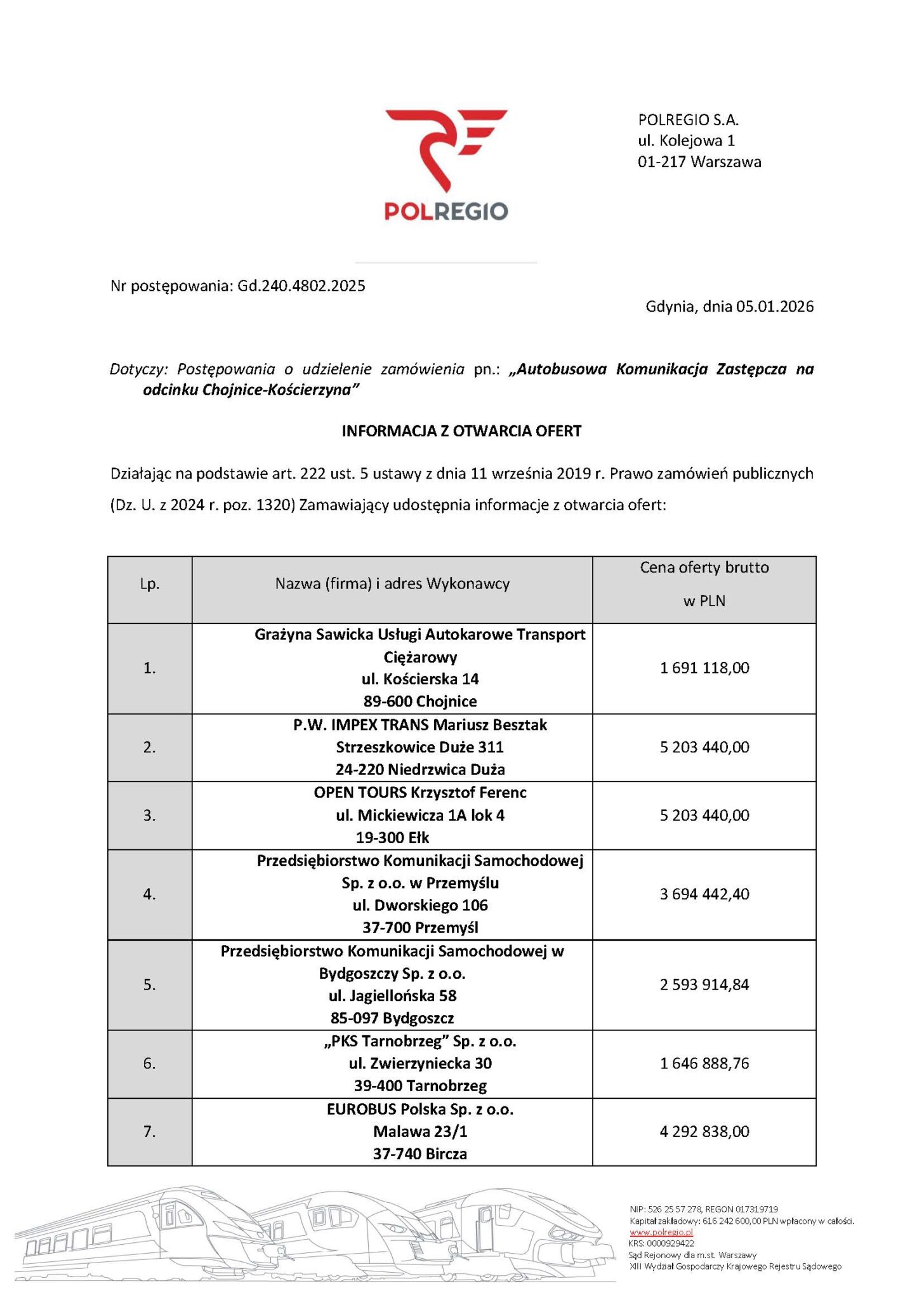 Najkorzystniejszą ofertę złożyła firma Grażyna Sawicka Usługi Autokarowe Transport Ciężarowy z Chojnic. Wartość tej propozycji wyniosła 1.051.094,88 PLN brutto, czyli 973.236 PLN netto, co przy zakładanej pracy przewozowej daje cenę jednostkową netto za jeden wzkm na poziomie 4,04 PLN netto.