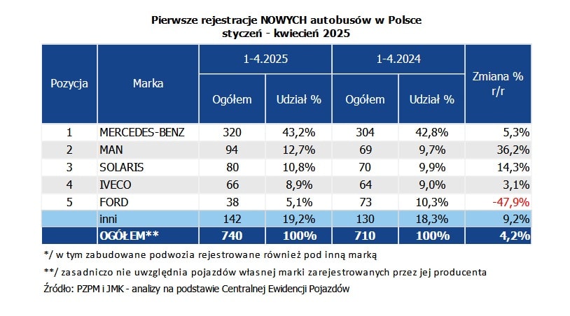 - Ile wyniosła łączna liczba zarejestrowanych nowych autobusów w Polsce w okresie styczeń–kwiecień 2025 roku i jaka była zmiana rok do roku?