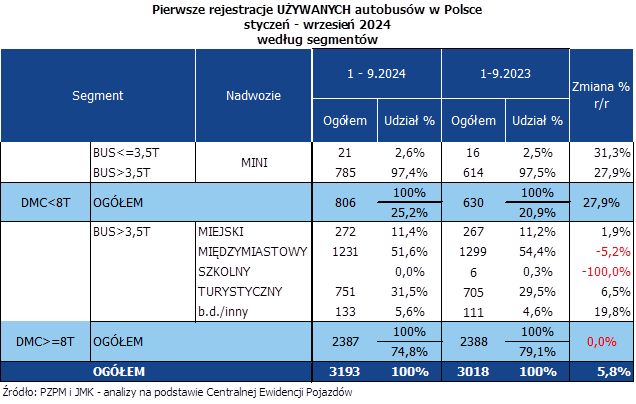 Oczywiście nadal istnieją duże różnice pomiędzy poszczególnymi segmentami. Największa dysproporcja – na korzyść rynku wtórnego – panuje niezmiennie wśród autobusów międzymiastowych i turystycznych. W pierwszej z tych kategorii zarejestrowano od początku 2024 roku 1231 pojazdów używanych wobec 73 nowych; natomiast w drugim: 751 autokary używane wobec 292 nowych. Natomiast dzięki zwiększonej sprzedaży nowych minibusów w tym roku, zmieniła się sytuacja segmentu MINI, który jest teraz większy niż na rynku wtórnym (878 do 806). Cały czas też więcej nowych autobusów niż na rynku wtórnym sprzedaje się w segmencie miejskim (317 do 272), natomiast ta różnica nie jest już tak duża, jak w poprzednich latach.