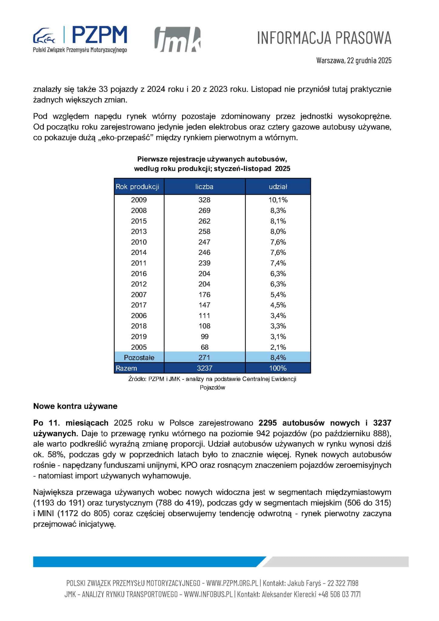 Po 11. miesiącach 2025 roku w Polsce zarejestrowano 2295 autobusów nowych i 3237 używanych. Daje to przewagę rynku wtórnego na poziomie 942 pojazdów (po październiku 888), ale warto podkreślić wyraźną zmianę proporcji. Udział autobusów używanych w rynku wynosi dziś ok. 58%, podczas gdy w poprzednich latach było to znacznie więcej. Rynek nowych autobusów rośnie – napędzany funduszami unijnymi, KPO oraz rosnącym znaczeniem pojazdów zeroemisyjnych – natomiast import używanych wyhamowuje.