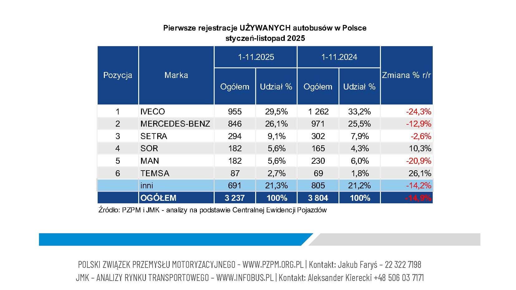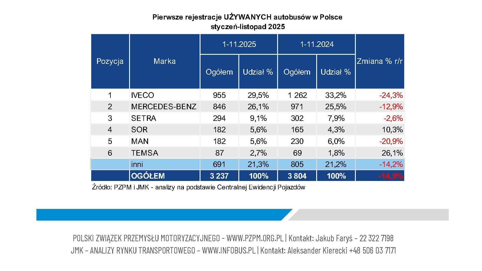 - Która marka była liderem rynku używanych autobusów po okresie styczeń–listopad 2025?