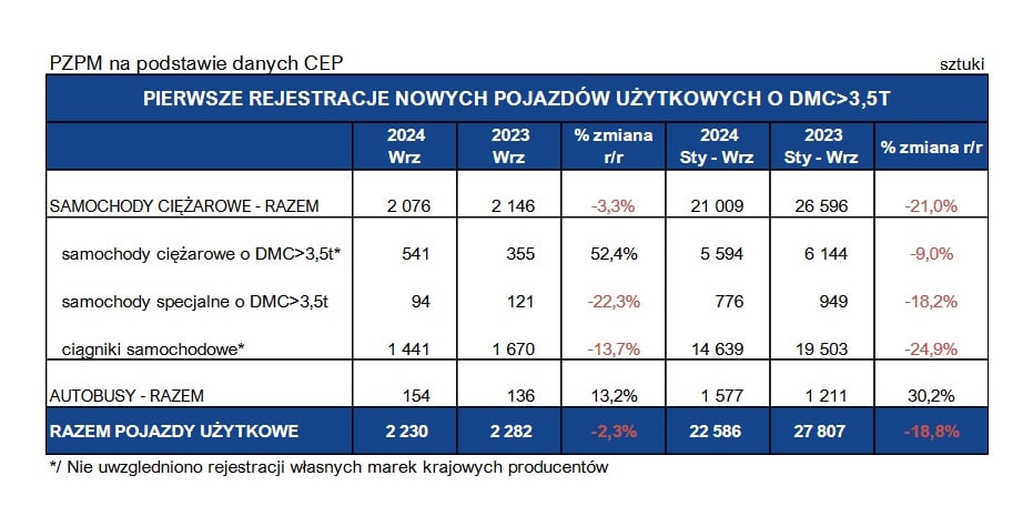 Od początku 2024 roku przybyło 22 586 szt. nowych pojazdów użytkowych o DMC pow. 3,5t. co oznacza spadek (-18,8%) w skali roku. W grupie samochodów ciężarowych rejestracji było 21 009 czyli 21% mniej niż w 2023r., a grupa autobusów zwiększyła się w tym czasie o 30,2% do 1 577 szt.