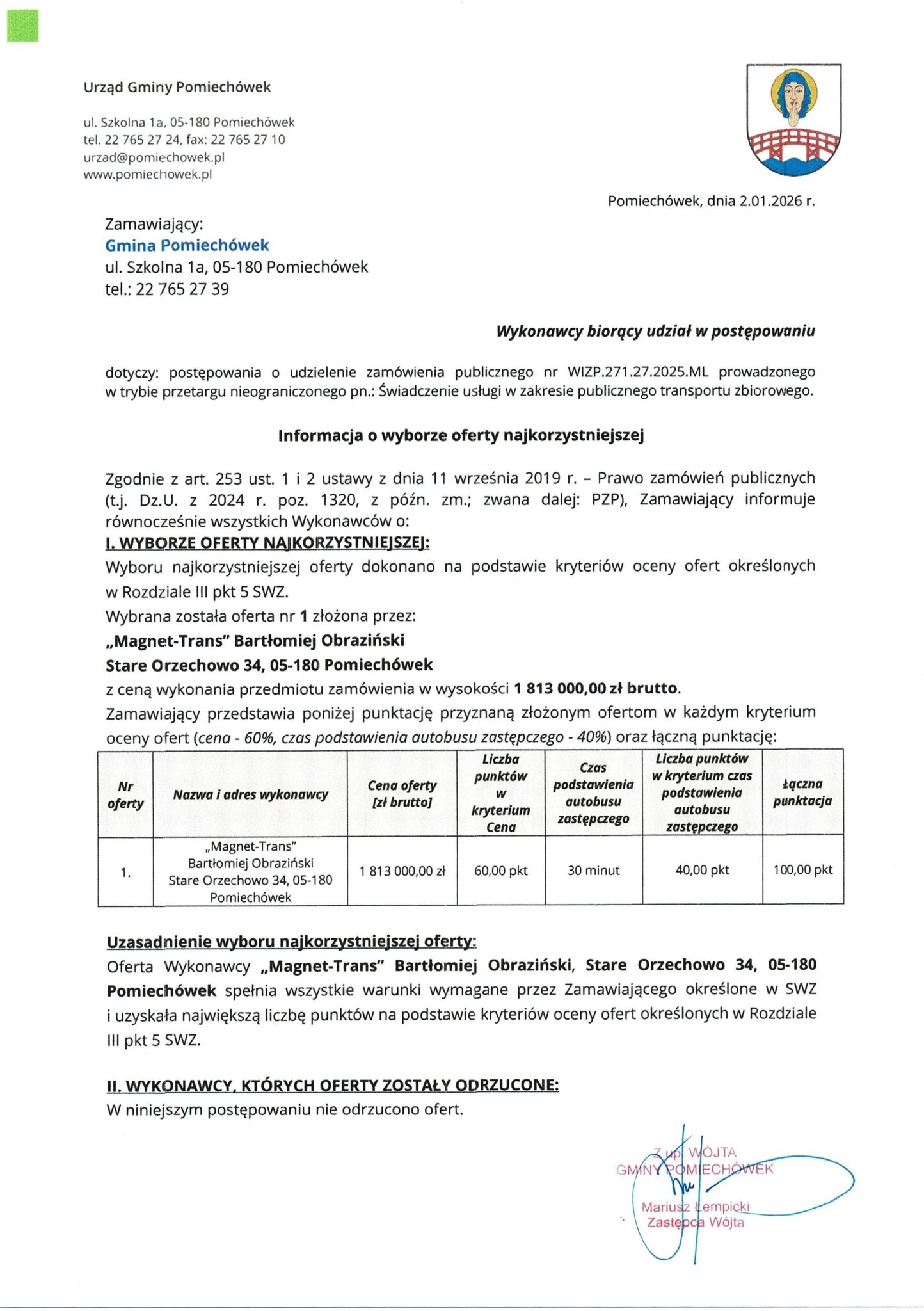 Zgodnie z decyzją z 2 stycznia 2026 r. zwycięzcą postępowania została firma Magnet-Trans Bartłomiej Obraziński ze Starego Orzechowa, która zaproponowała realizację kontraktu za 1.813.000 PLN brutto. Oznacza to wartość 1.678.704 PLN netto, co daje cenę jednostkową netto za jeden wzkm na poziomie 4,54 PLN netto.