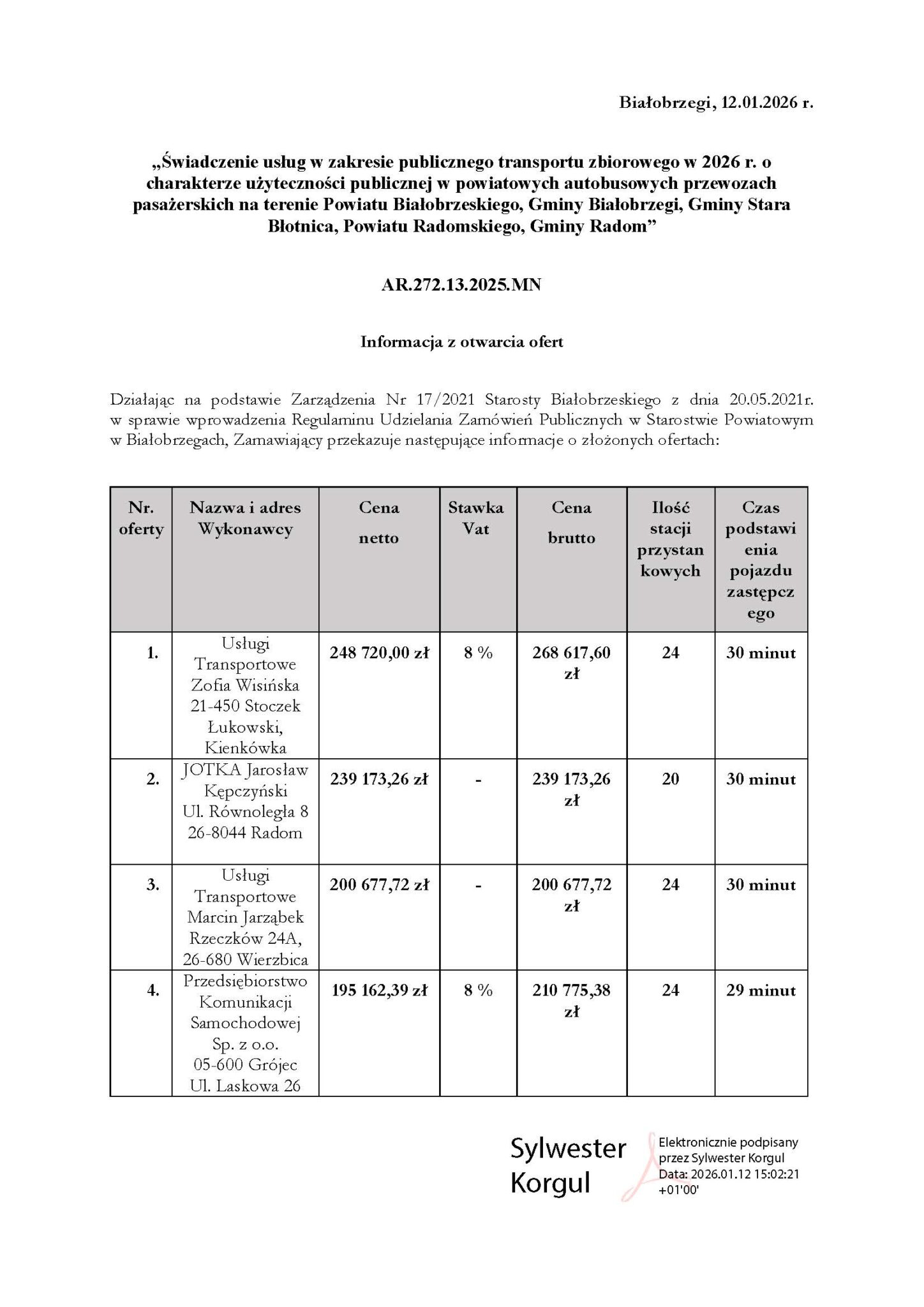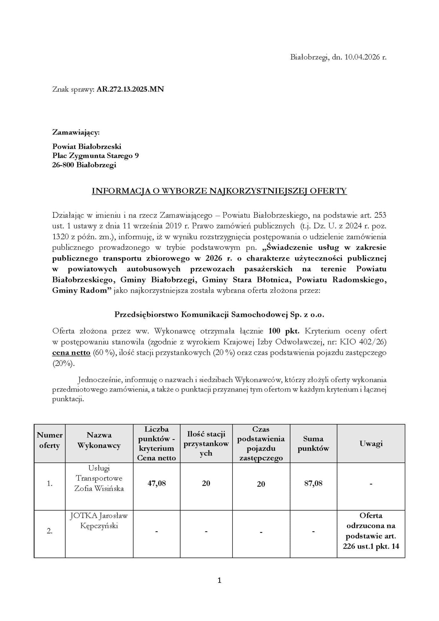17 kwietnia 2026 roku Powiat Białobrzeski podjął decyzję o wyborze najkorzystniejszej oferty w przetargu na świadczenie usług transportu publicznego w 2026 roku.