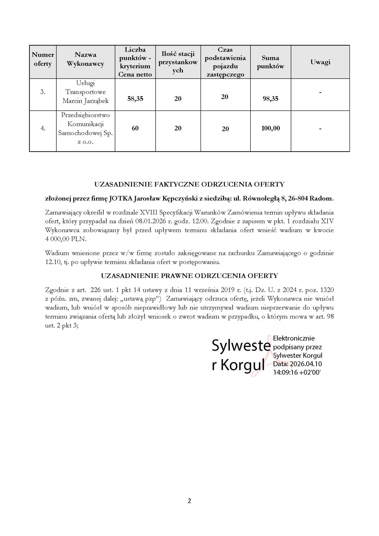 Usługi Transportowe Marcin Jarząbek osiągnęły bardzo dobry wynik punktowy (98,35 pkt), tracąc jedynie na wyższej cenie. Z kolei Usługi Transportowe Zofia Wisińska uzyskały 87,08 pkt, co wynikało głównie z najwyższej ceny w zestawieniu. Odrzucenie oferty JOTKA Jarosław Kępczyński pokazało, jak istotne są formalne wymogi przetargowe – mimo konkurencyjnej ceny wykonawca nie został dopuszczony do oceny punktowej.